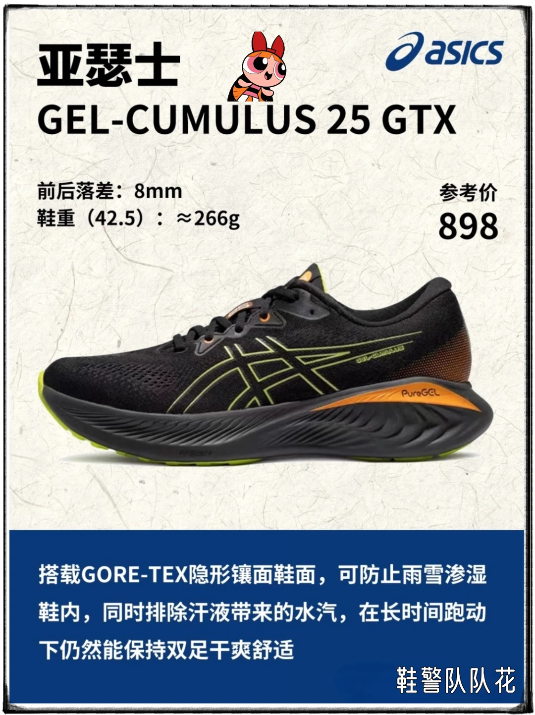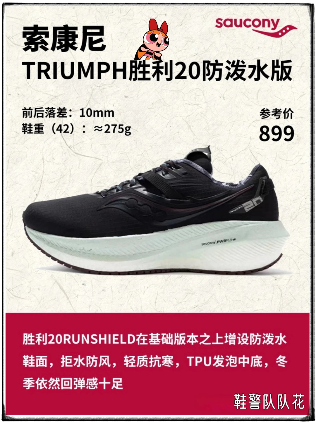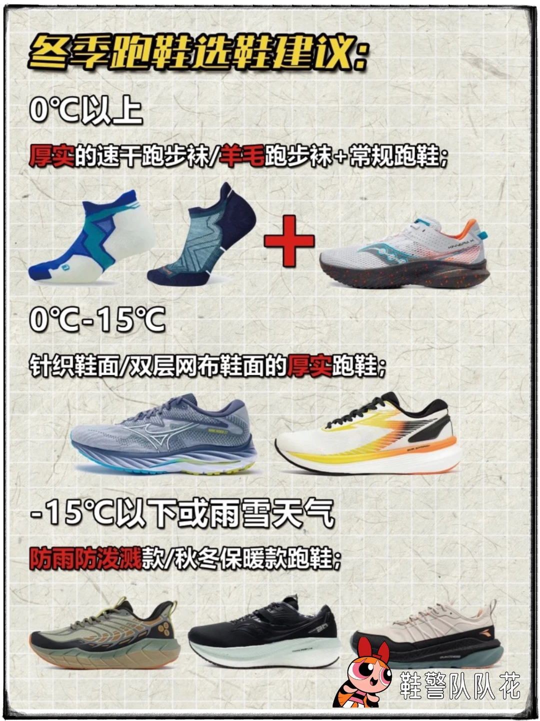 随着秋冬季节的到来,跑鞋选择也变得尤为重要。今天为大家带来12双专为秋冬训练设计的专业跑鞋,让你的冬训更加轻松!冬天肯吃苦,开春猛如Hu!希望这些能为你的冬季选鞋提供一些实用参考哦~ 冬季跑鞋需求: 鞋面——房水透气 选择以GTX为代表的房水透气鞋面,不仅能房风房水,还兼具透气性。 鞋头——房撞设计 硬质橡胶或胶印图层的鞋头可以很好地保护脚趾,同时保持易湿的鞋头干爽。 后跟——支撑保护 在结冰的冬季,选择刚性较好的后跟设计能够保持落地稳定。 中底——软弹缓震 避免使用EVA材料的鞋子,因为气温在零摄氏度以下会让其变硬。建议选择非EVA的发泡材质,确保保护性和良好的脚感。 外底——房滑耐磨 可以优先选择Vibram大底或者具备高凸起和房滑纹路设计的跑鞋,让你在冰雪路面中行走更稳。 📢 **个人选鞋建议:** ☀️ **0℃以上** 搭配厚实的速干/羊毛跑步袜,选择常规跑鞋即可。 🌤️ **0℃-15℃** 可以选择针织鞋面或双层网布鞋面的厚实跑鞋,提供更好的保暖和支持。 ❄️ **-15℃以下或雨雪天气** 建议选择房雨房泼溅款或秋冬保暖款跑鞋,以应对坏天气。希望这些鞋能助你在秋冬季节中尽情体验跑步的乐趣!💪🌟
