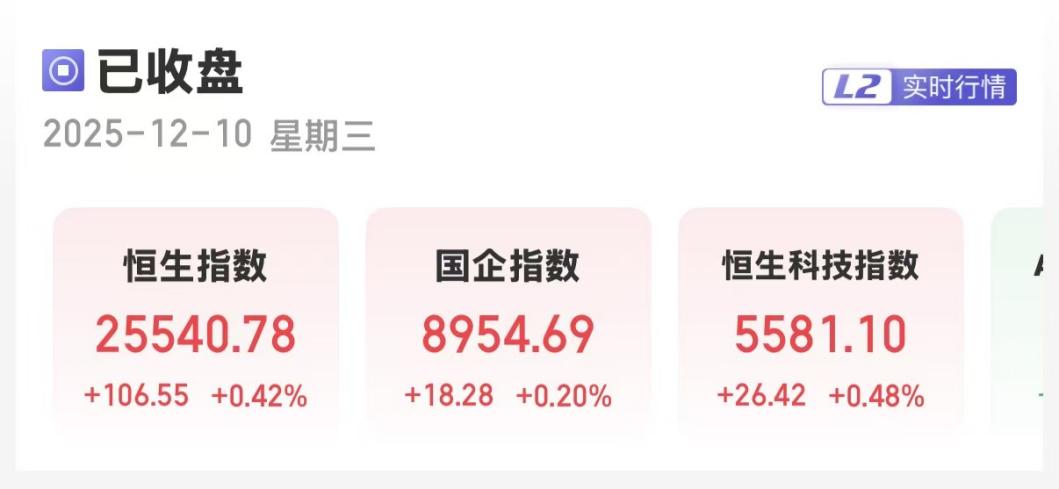 上证报中国证券网讯(卢伊记者严晓菲)12月10日,港股三大指数集体收涨。截至收盘,恒生指数涨0.42%,报25540.78点;恒生国企指数涨0.20%,报8954.69点;恒生科技指数涨0.48%,报5581.10点。