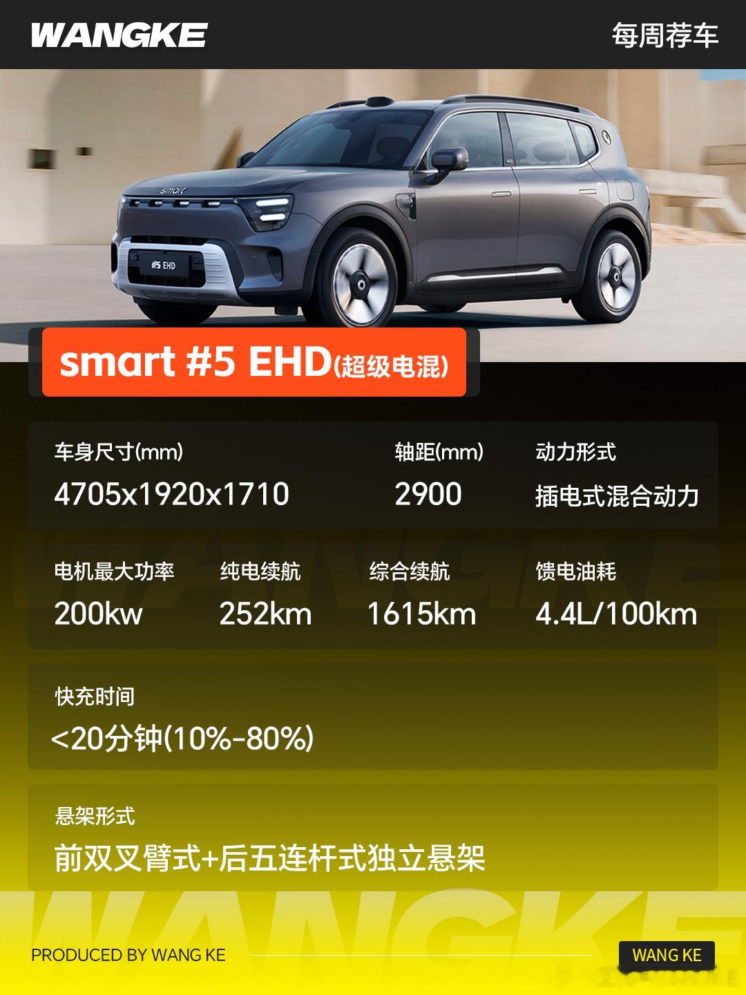 每周荐车 【smart精灵5号EHD】如果您正在寻找一款20万左右,能兼顾日常通勤与家庭出游的全能座驾,smart精灵5号 EHD超级电混是一个值得重点考虑的选择。它由梅赛德斯-奔驰团队设计,融合了豪华质感与吉利先进的混动技术。这款车的一大亮点是其 EHD超级电混系统,基于雷神电混2.0技术打造,实现了“稳、顺、静、省、远”的综合体验。其CLTC纯电续航最高达252公里,足以覆盖一周的城市通勤,成本极低;综合续航更高达1615公里,彻底消除了长途出行的里程焦虑,且亏电油耗仅4.4L/100km,非常经济。作为一款“新奢电混大五座SUV”,它的轴距达到2900mm,车内空间宽敞,后备厢容积可在625L至1525L之间灵活变换,满足多种家庭出行场景。座舱内标配双13英寸AMOLED超清联屏、AR-HUD抬头显示等组成的多屏交互系统,科技感十足。同时,零重力座椅和20扬声器森海塞尔音响等配置,进一步提升了驾乘的舒适与豪华感。smart精灵5号EHD以16.99万元起的限时售价,提供了超越同级的续航、豪华配置和智能体验,是都市家庭实现全场景高品质出行的理想之选。大v聊车