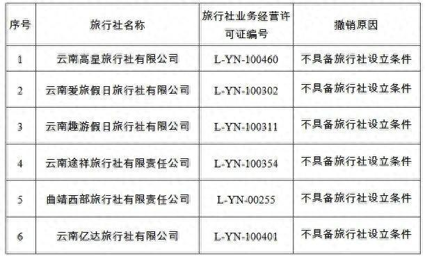 经查,云南高星旅行社有限公司等6家旅行社企业因无固定经营场所、无必要的营业设施等原因,已不具备《中华人民共和国旅游法》第二十八条和《旅行社条例》第六条规定的设立旅行社条件。根据《中华人民共和国行政许可法》第六十九条和《旅游行政许可办法》第四十五条之规定,曲靖市文化和旅游局拟撤销云南高星旅行社有限公司等6家企业旅行社业务经营许可,具体情况如下: