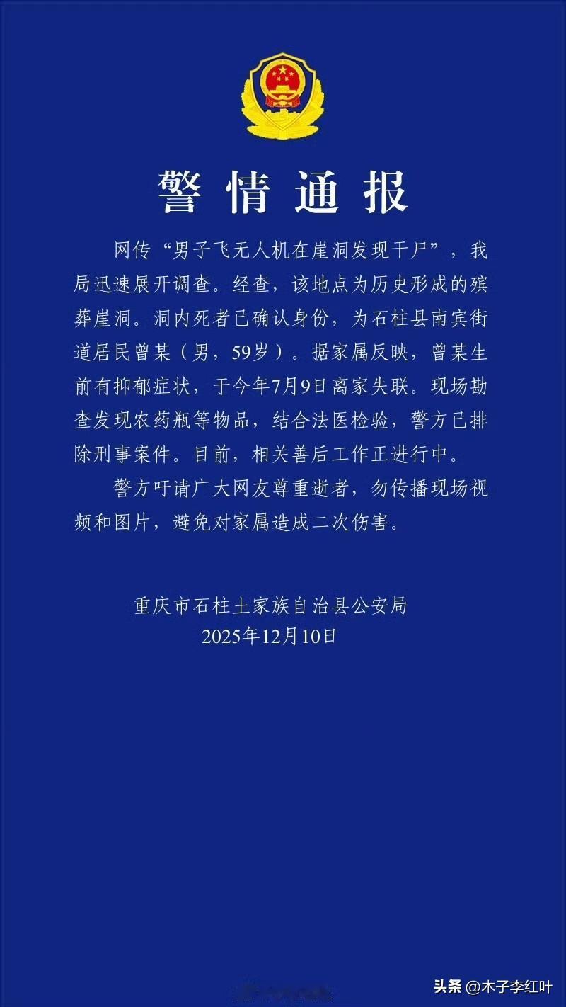 重庆一男子飞无人机时在崖洞中发现干尸,已报警处理。 看着有点像,我好多年前看到过