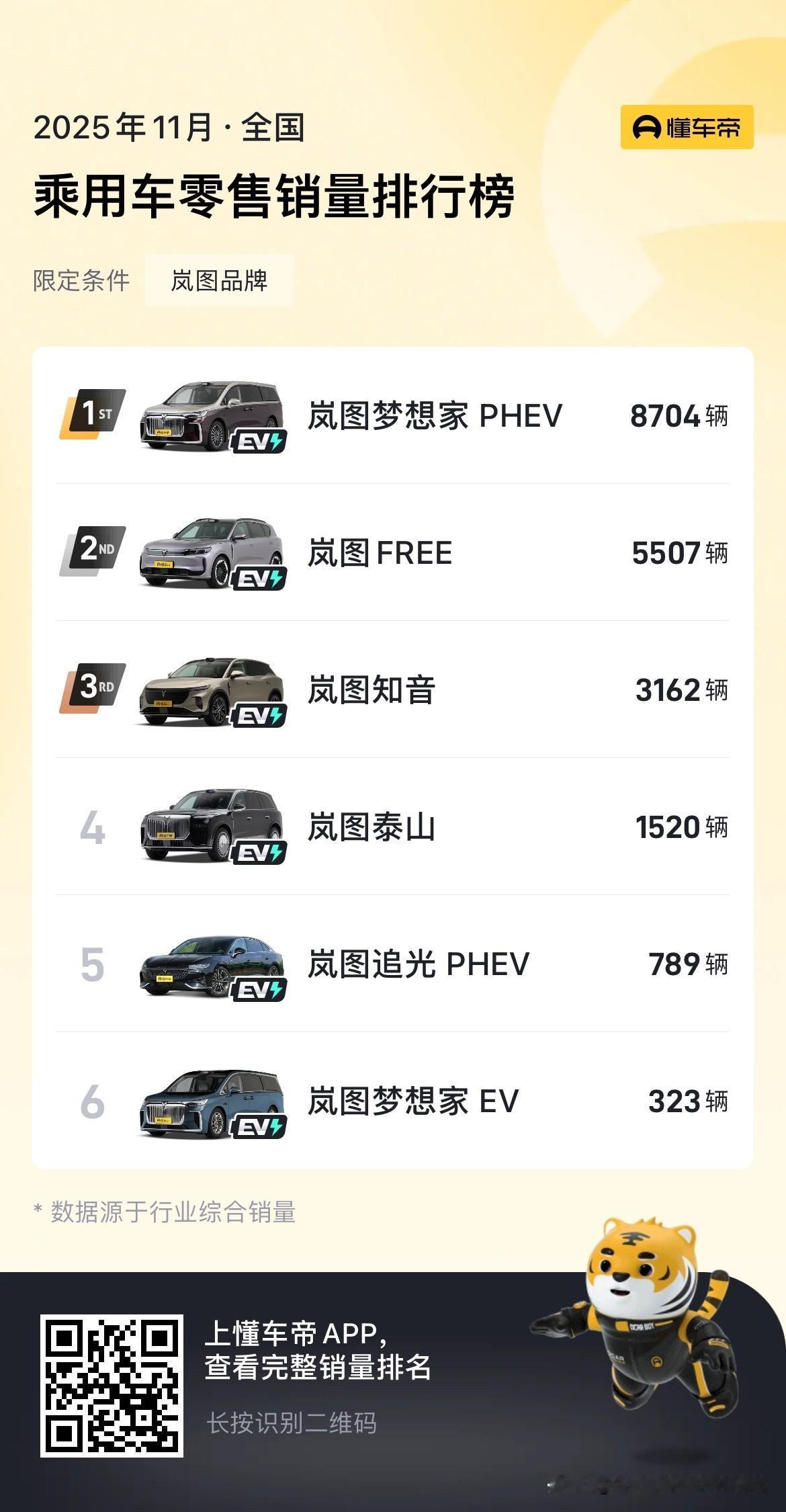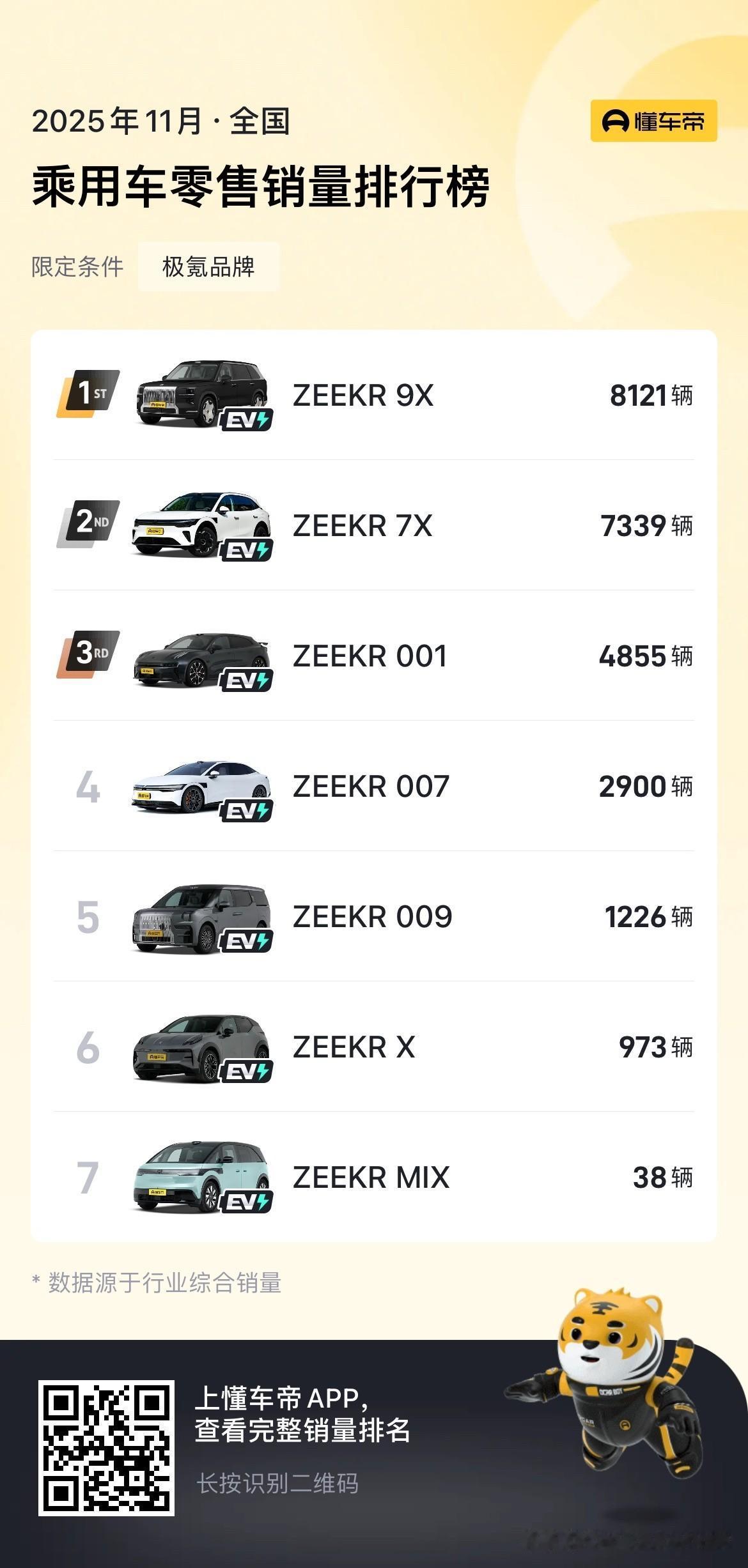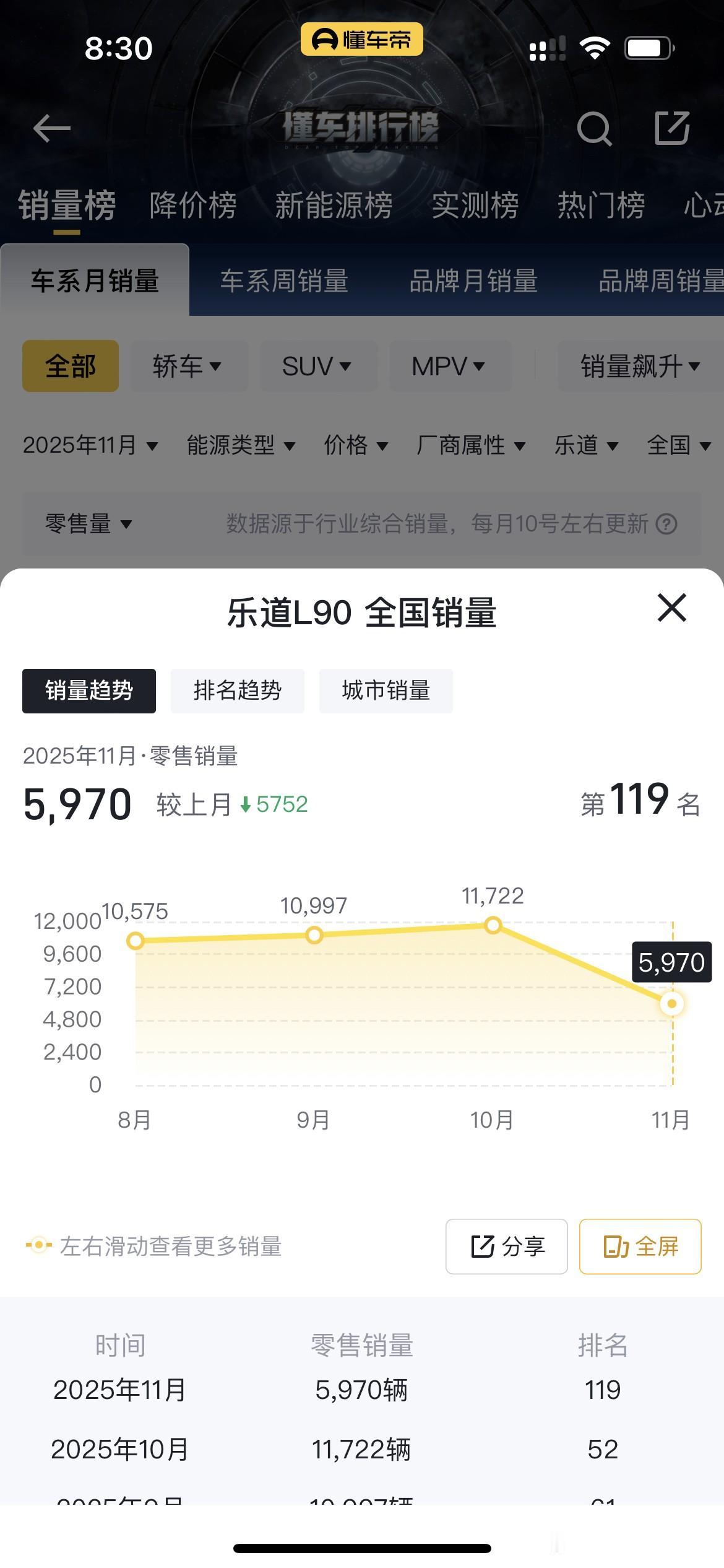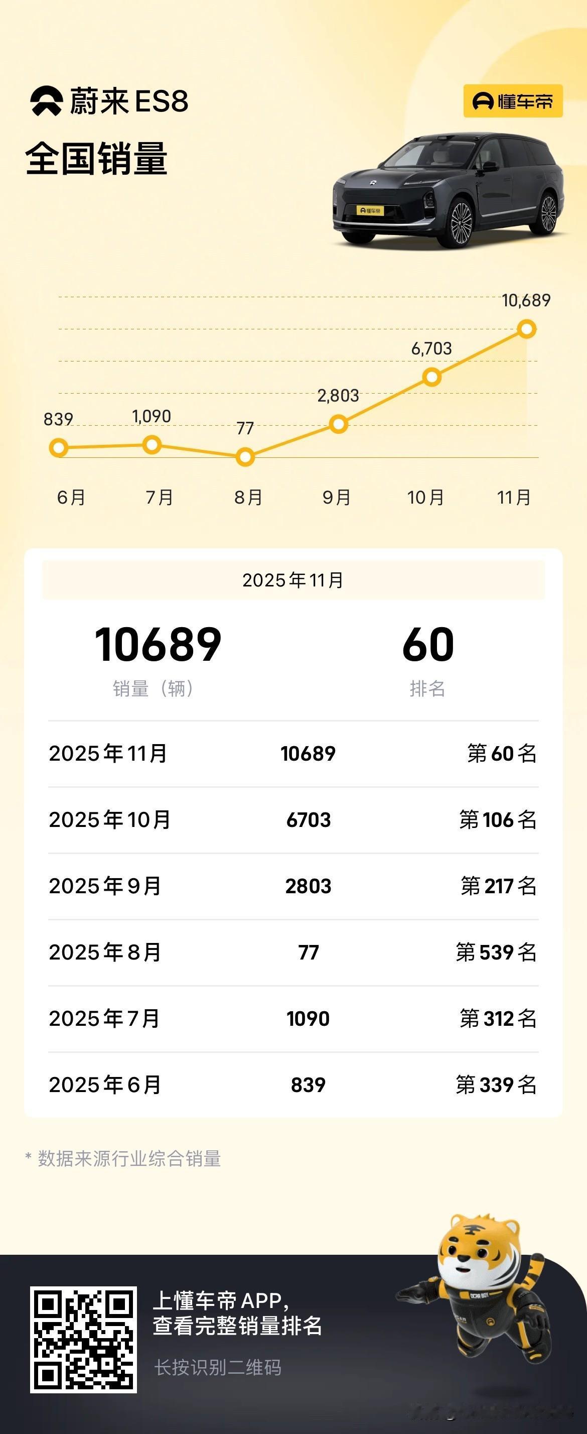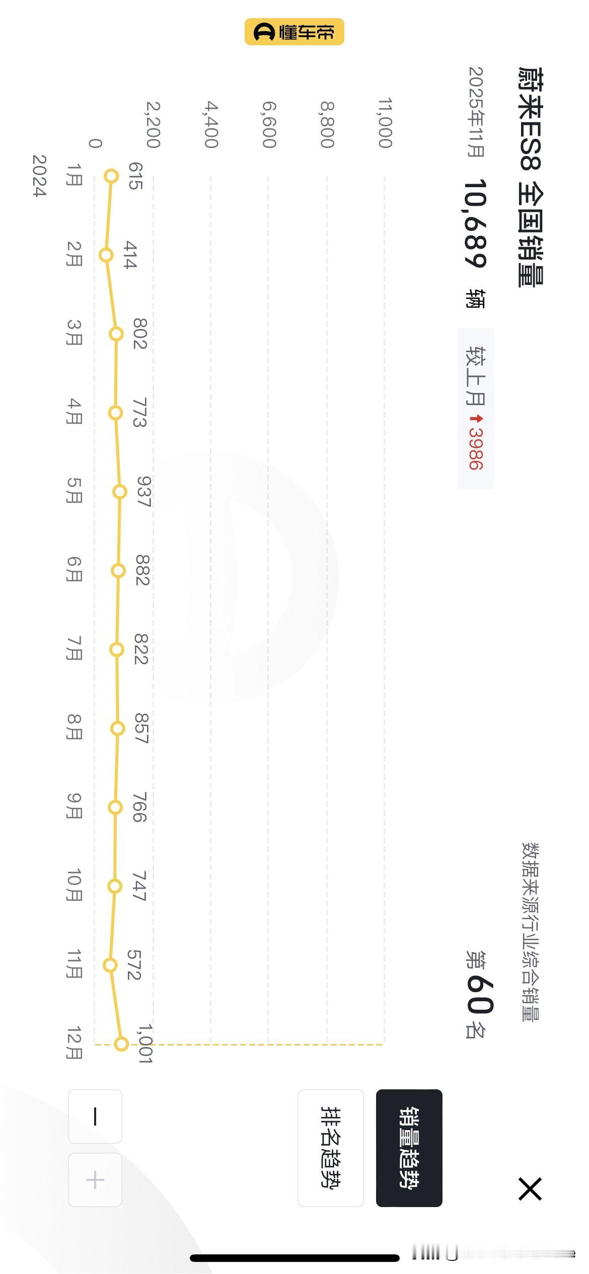 蔚来ES8一个月卖了去年一年的销量,这次换代确实太成功了。 11月蔚来ES8卖了10689辆,比十月份又多了3000多辆。初步计算了一下,2024年一整年的销量也没有一万辆,2024年蔚来ES8每个月的销量基本上都在600-1000辆。 竞品方面,理想L9在11月卖了2208辆,问界M8卖了16284辆,极氪9X卖了8121辆,岚图泰山卖了1520辆。 理想L9基本上都是产品生命周期了,明年换代的话估计产品力会有很大的提升。问界M8一直都很猛,目前来看蔚来ES8未来是有可能挑战问界M8的销量的。 不过蔚来旗下的乐道L90上个月就没那么好运了,11月乐道L90销量为5970辆,相比10月几乎腰斩,难道是让产能给蔚来ES8了?