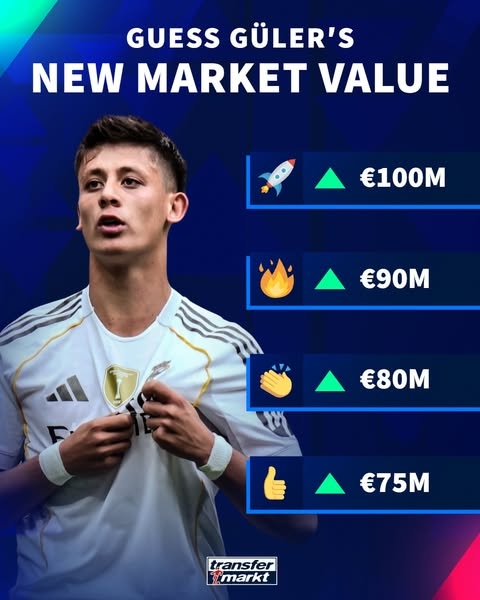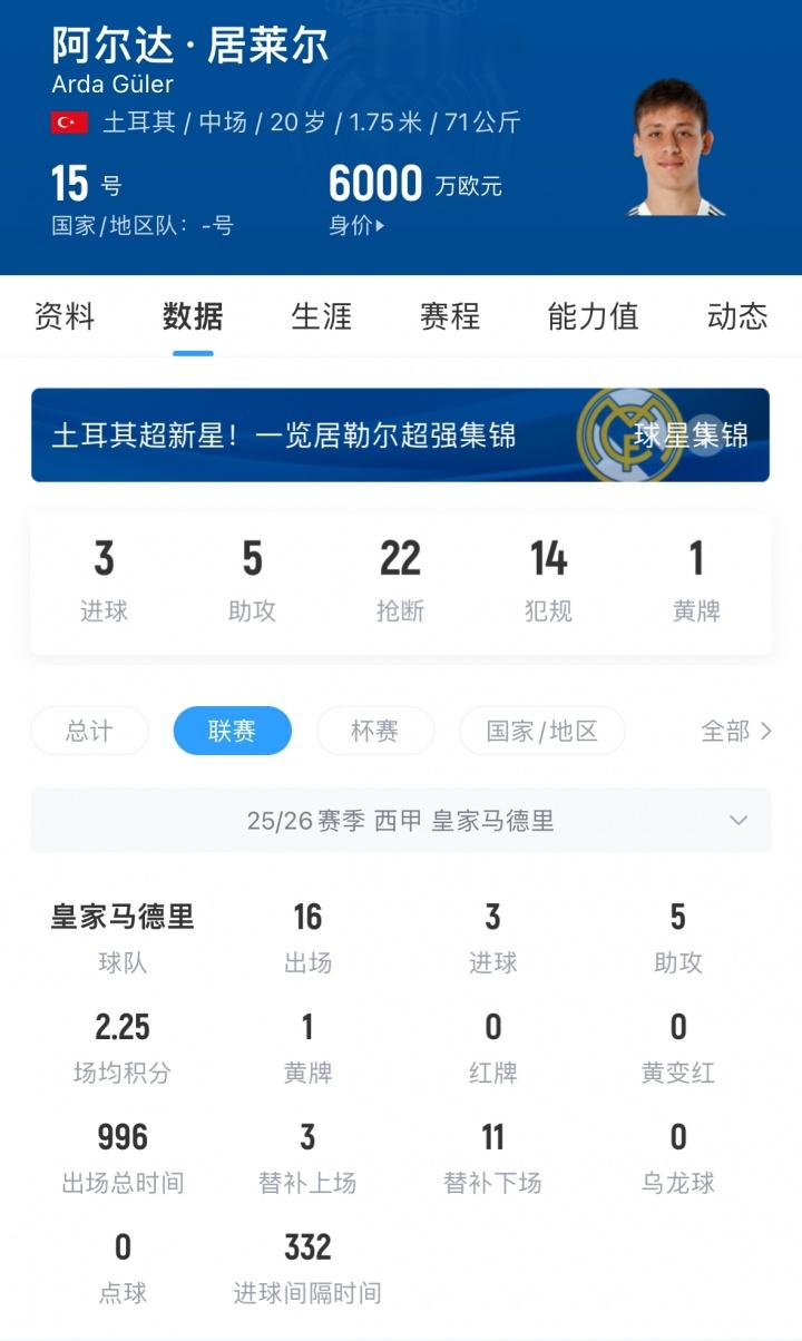 居莱尔现年20岁,他本赛季为皇马出战21场比赛,贡献3球7助,现身价6000万欧。