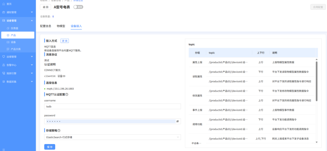 设置设备接入方式、连接信息、数据存储方式,图中以MQTT为例