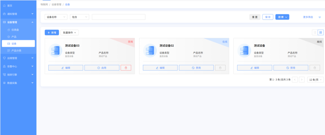 通过抽象设备属性(状态)、功能(能力)、事件(通知),实现设备类型标准化。支持对海量设备的行增删改查、状态监控与分组管理,形成清晰的设备资产视图,让每一台设备的运行轨迹都可追溯。