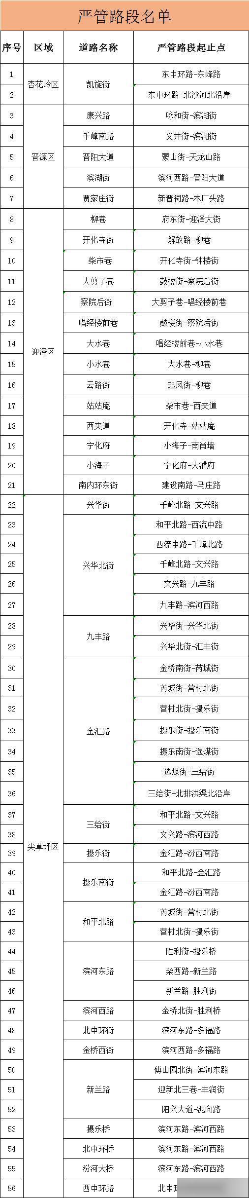 为改善城市道路交通环境,规范停车秩序,提高道路通行效率,结合目前市区停车现状和群众反映较为突出的停车乱点,根据《中华人民共和国道路交通安全法》《中华人民共和国道路交通安全法实施条例》《山西省实施〈中华人民共和国道路交通安全法〉办法》及相关规程,公安机关交通管理部门经过前期研判和评估,及在前阶段公布两批严管示范街的基础上,决定将下列道路新增(启用)为严格管理道路(简称“严管道路”),具体事项公布如下: