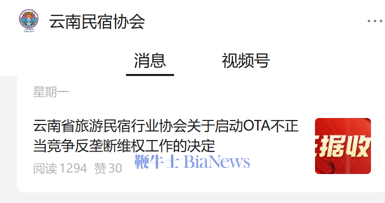 12月10日消息,鞭牛士获悉,云南民宿协会公众号近日发布公告,宣布将启动反垄断维权工作。