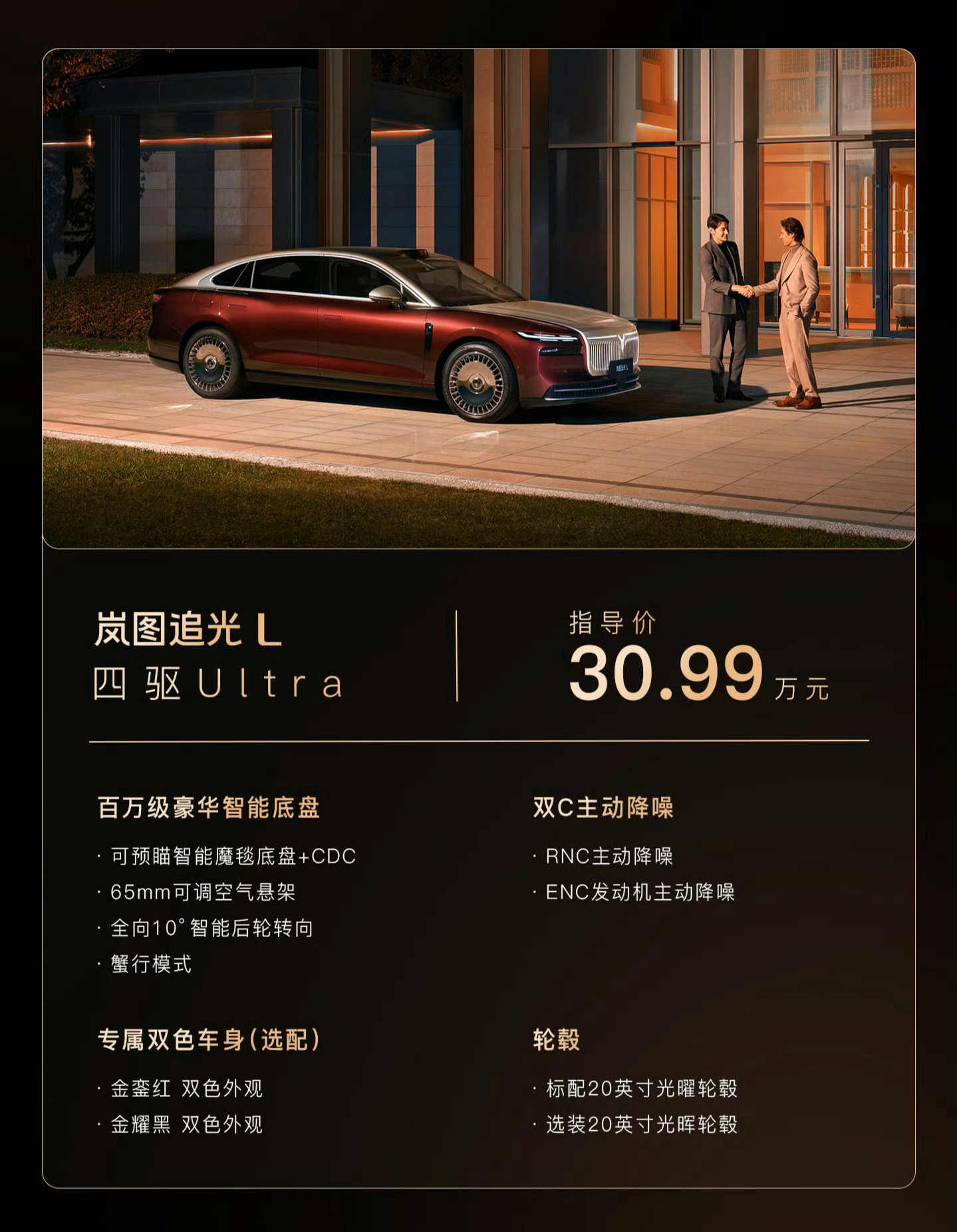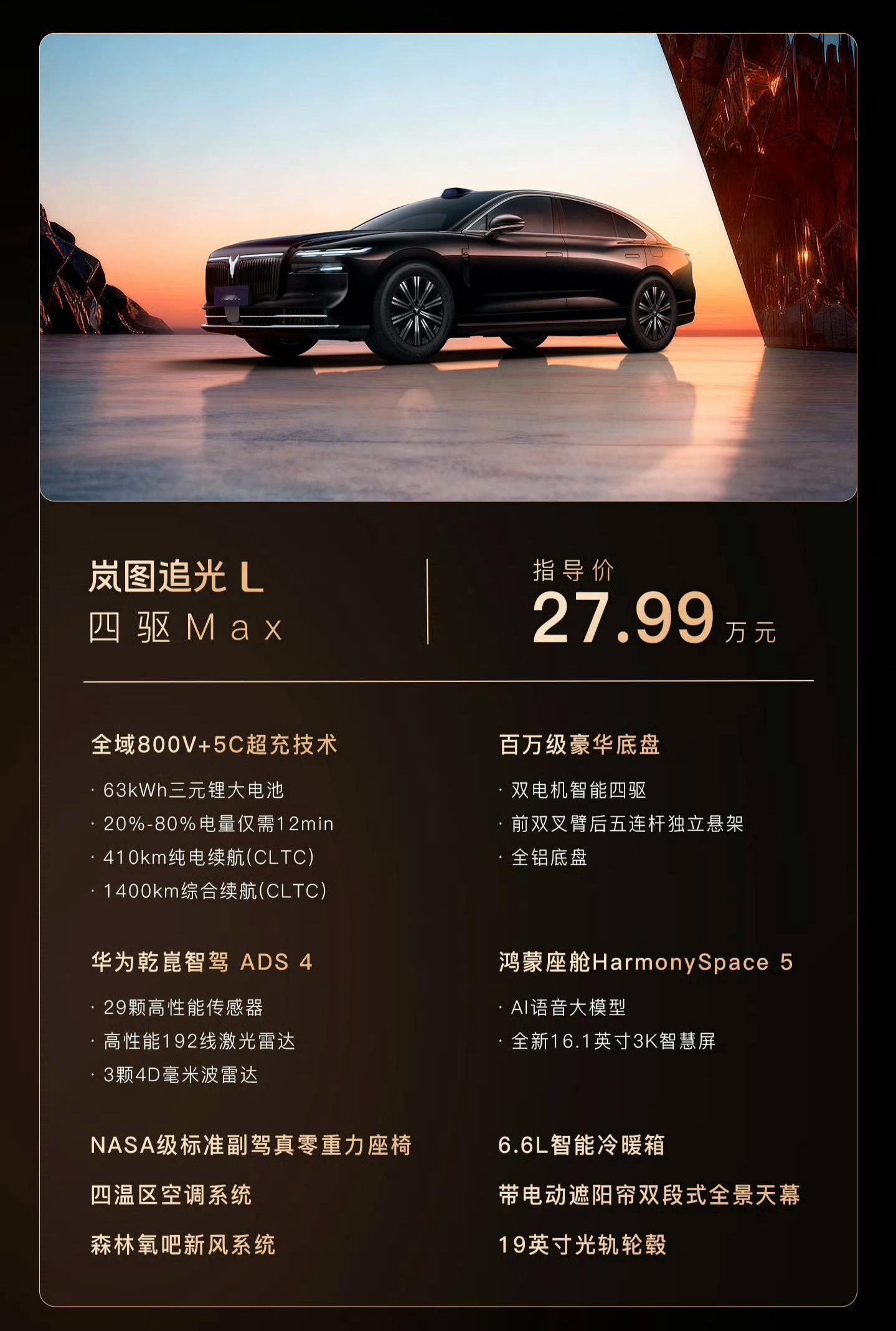 岚图追光L上市,中大型插混轿车,两款车型,27.99万和30.99万,这个价格怎么样?车长5125mm,轴距3010mm,外观很尊。内饰设计比较平淡,搭载鸿蒙座舱和乾崑智驾。标配前后排加热通风按摩、副驾零重力座椅、23扬声器音响、冰箱。1.5T发动机+双电机,标配四驱,零百4.8 秒。63度三元锂电池,CLTC纯电续航410km。高配有CDC+空气悬架+后轮转向。
