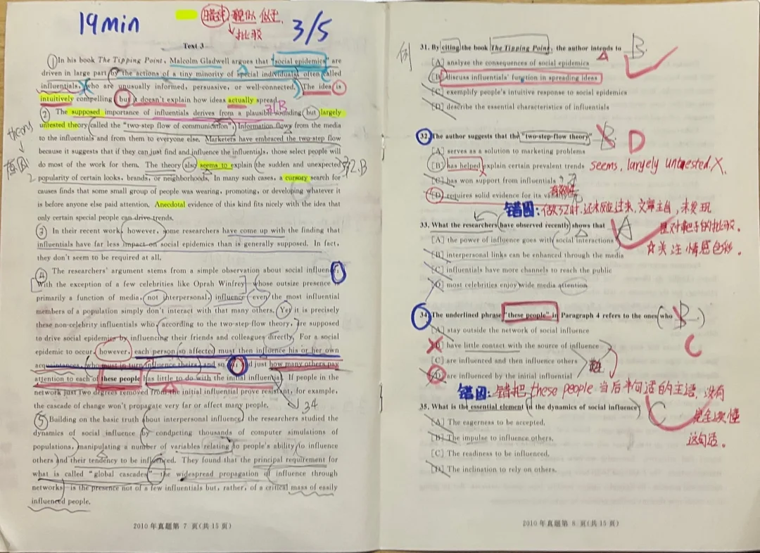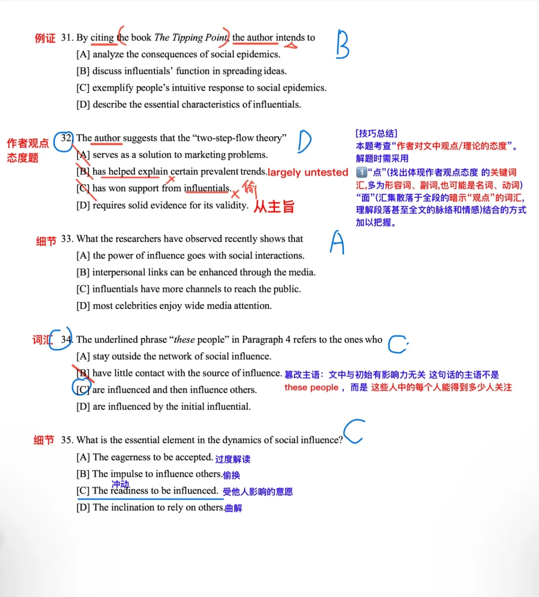 【34题B】:篡改主语:文中与初始有影响力无关 这句话的主语不是 these people ,而是 这些人中的每个人能得到多少人关注