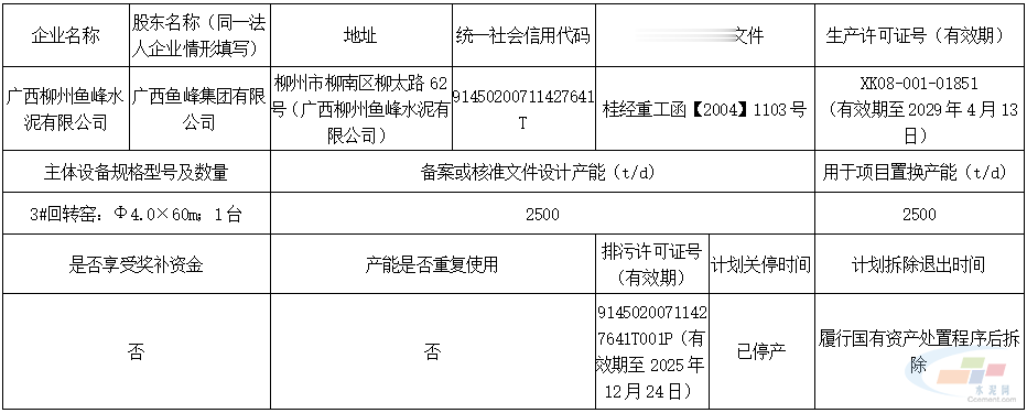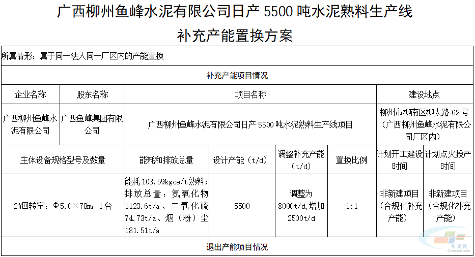 公示内容显示,广西柳州鱼峰水泥有限公司日产5500吨水泥熟料生产线项目产能调整为8000t/d,增加2500t/d,置换比例为1:1。