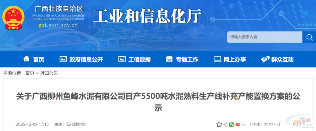 12月9日,广西壮族自治区工业和信息化厅发布关于广西柳州鱼峰水泥有限公司日产5500吨水泥熟料生产线补充产能置换方案的公示,公示期为2025年12月9日至12月22日。