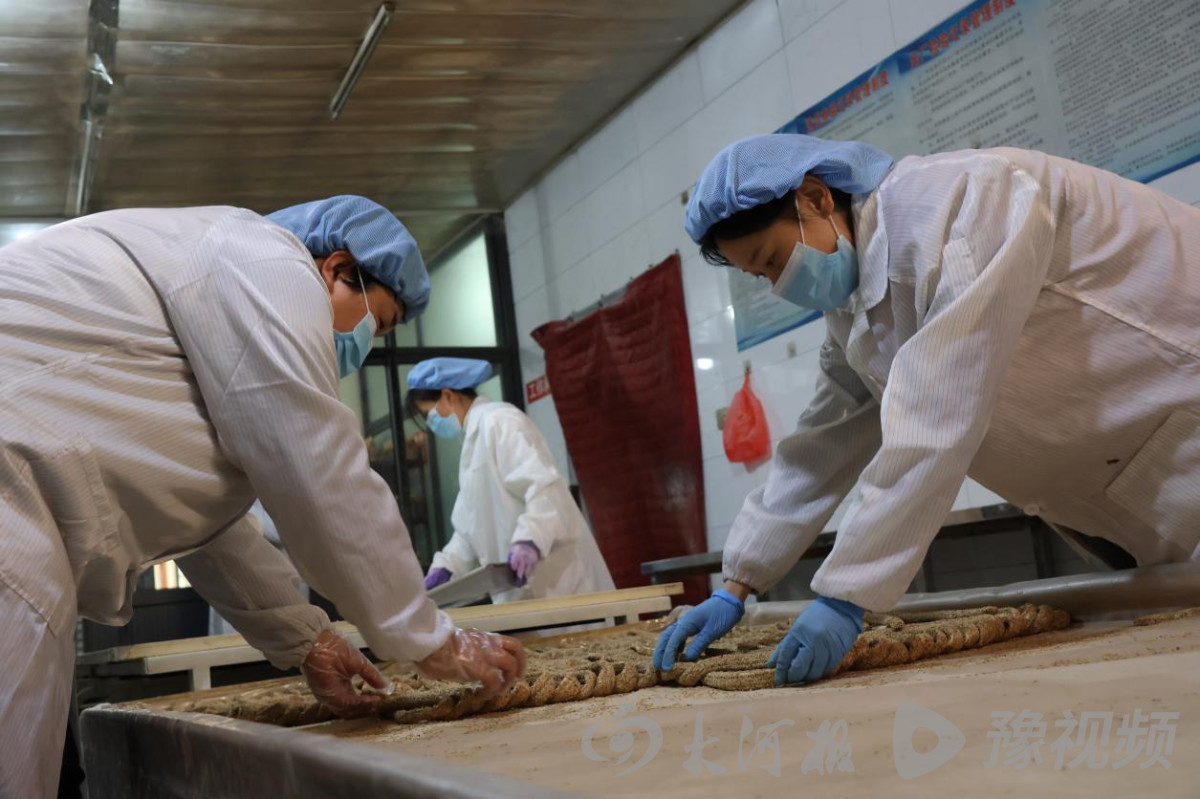 12月4日,制糖工人将粘好的芝麻的糖条拧成麻花状。赵林颖摄
