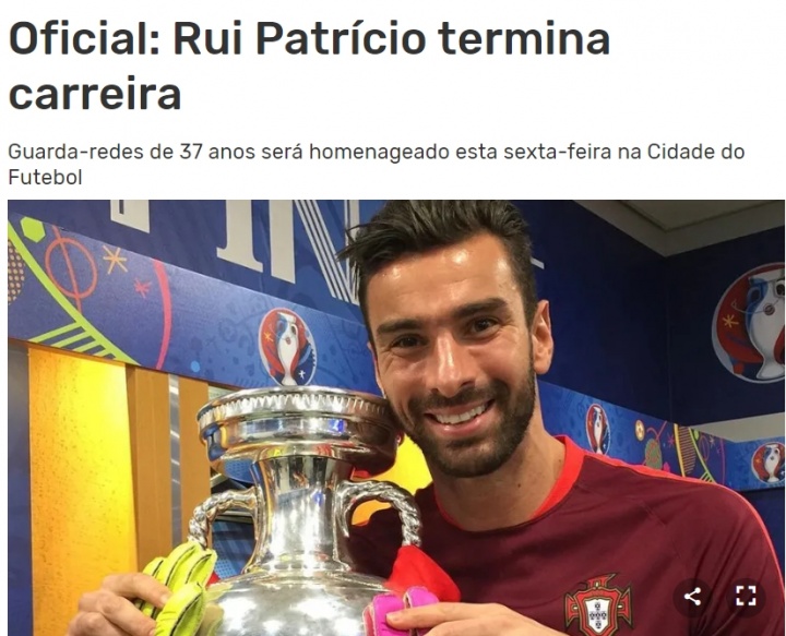 37岁的帕特里西奥生涯曾效力于葡萄牙体育、狼队、罗马等球队,今年夏窗成为自由球员。职业生涯中,帕特里西奥曾代表葡萄牙荣获2016年欧洲杯、2019年欧国联冠军等多项荣誉。