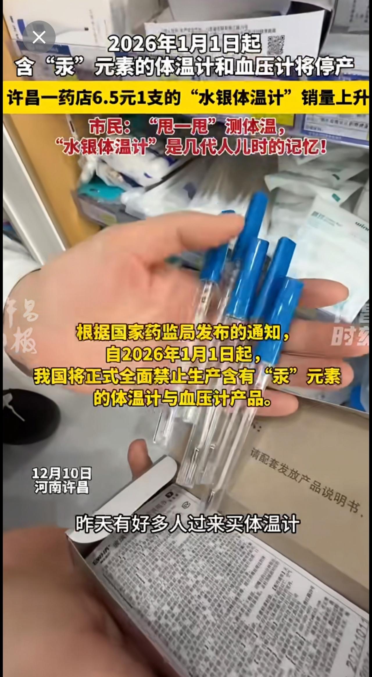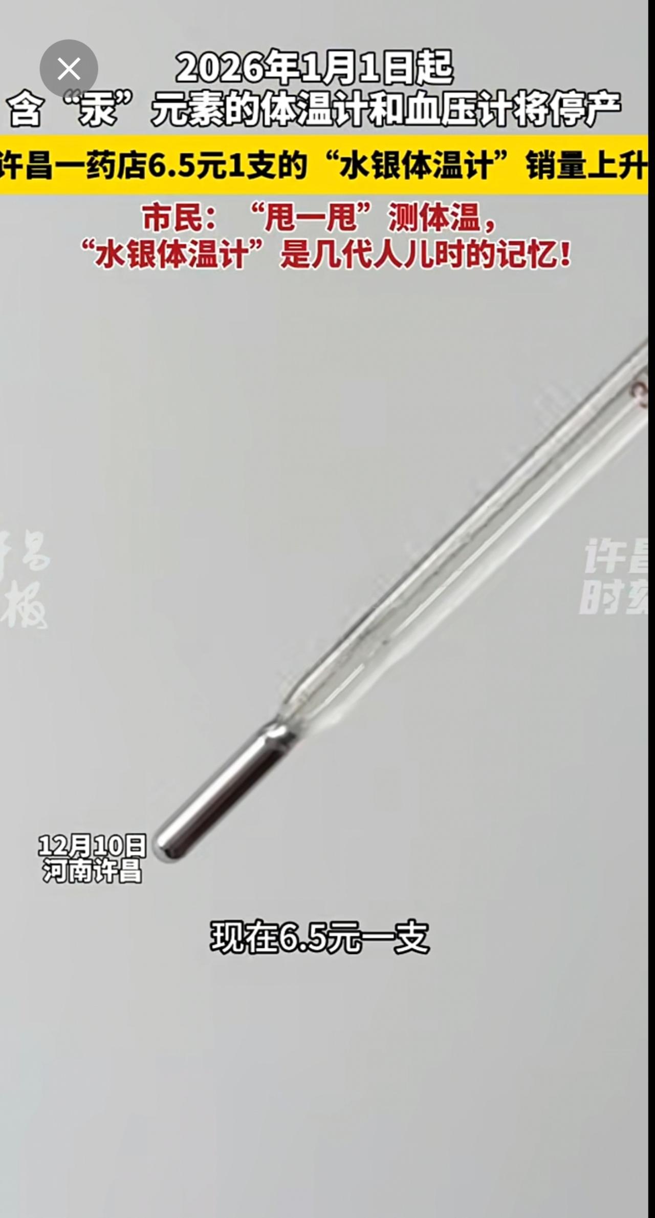 12月10日,河南许昌。2026年1月1日起,含“汞”元素的体温计和血压计将停产,许昌一药店6.5元1支的“水银体温计”销量上升,市民:“甩一甩”测体温,“水银体温计”是几代人儿时的记忆!含“汞”元素的体温计将停产 水银体温计 许昌 (记者:谭宜姝;编辑:朱琳)