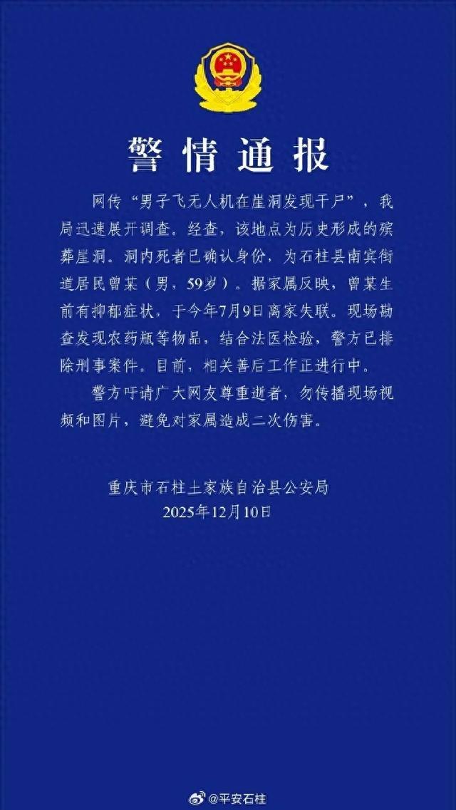 网传“男子飞无人机在崖洞发现干尸”,我局迅速展开调查。经查,该地点为历史形成的殡葬崖洞。洞内死者已确认身份,为石柱县南宾街道居民曾某(男,59岁)。据家属反映,曾某生前有抑郁症状,于今年7月9日离家失联。现场勘查发现农药瓶等物品,结合法检验,警方已排除刑事案件。目前,相关善后工作正进行中。