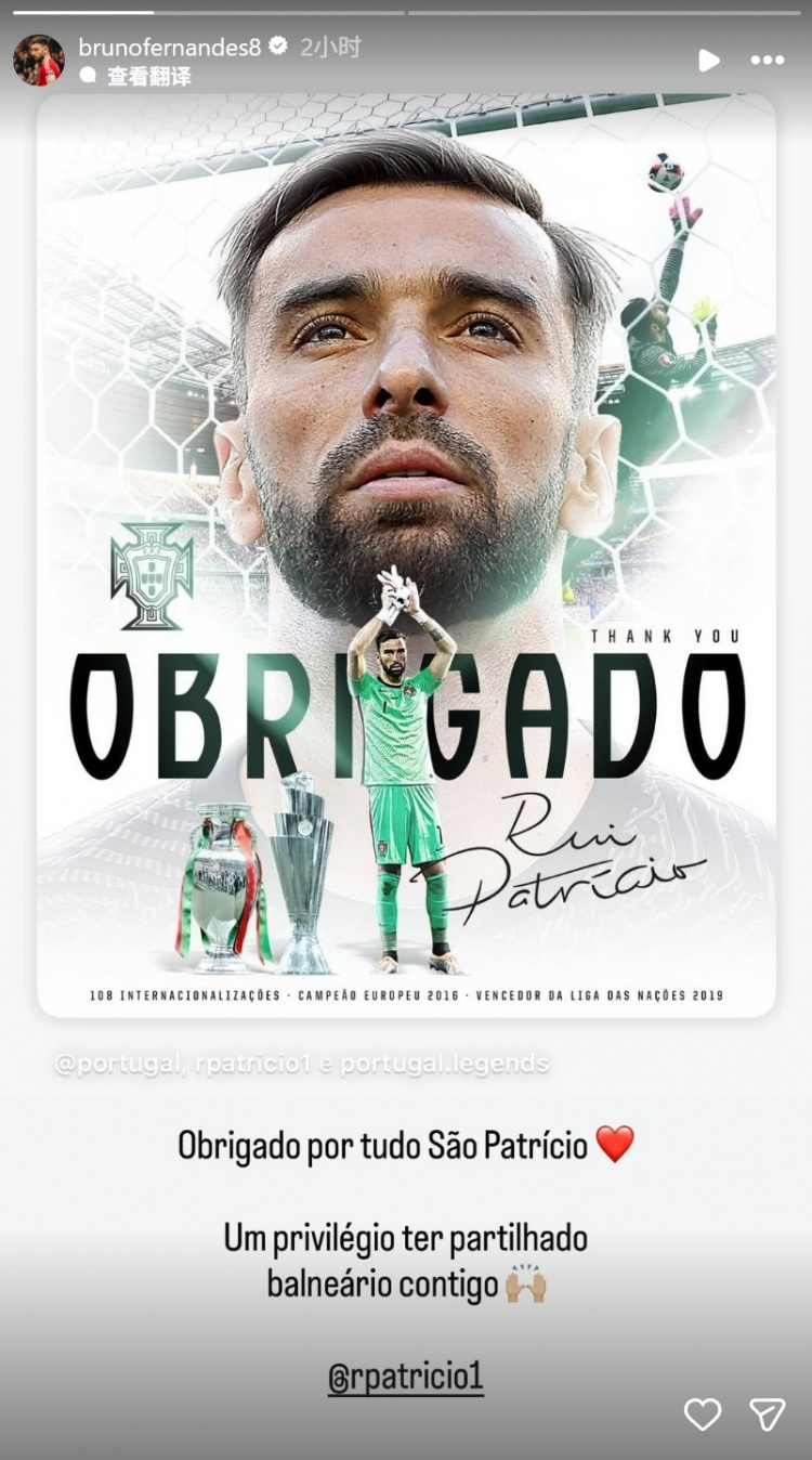 直播吧12月11日讯前葡萄牙国门帕特里西奥正式宣布退役,B费也在社媒晒出海报送上祝福。