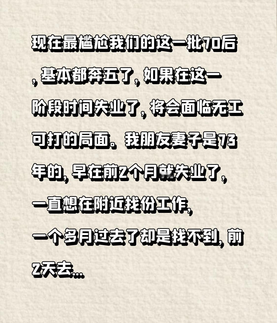 如今,最尴尬的当属我们这批70后,基本都过五十或者在奔五的路上。 要是在这个阶段失业,就会陷入无工可打的困境。 我朋友的妻子是73年的,早在两个月前就失业了。 由于她以灵活就业人员身份参保,距离领取退休金还差几年,所以一直想在家附近找份工作。 可一个多月过去了,始终没能找到。 前两天去一家大型超市,好不容易看到一家熟食店招打杂,月薪4000元,每月休2天。 但工作时间是从早上7点到中午12点,再从下午4点到晚上10点,足足要干11个小时,还不包吃的。后来她觉得工作时间太长,便不想干了。 她又说,其实超市里其他销售岗位是在招工的,工作8小时,月薪4500元,每月休4天,可却有年龄限制,超过45岁的不要! 唉,岁月真是一把杀猪刀,时间一去不复返了! 难难难,我们这批70后的人真难!