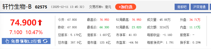 上证报中国证券网讯(记者杨子晏)12月11日,轩竹生物-B午后持续走高,盘中一度涨超13%,最高价报76.95港元/股。截至13时45分,轩竹生物-B报74.9港元/股,涨10.47%,成交额约3216万港元,总市值约387.9亿港元。