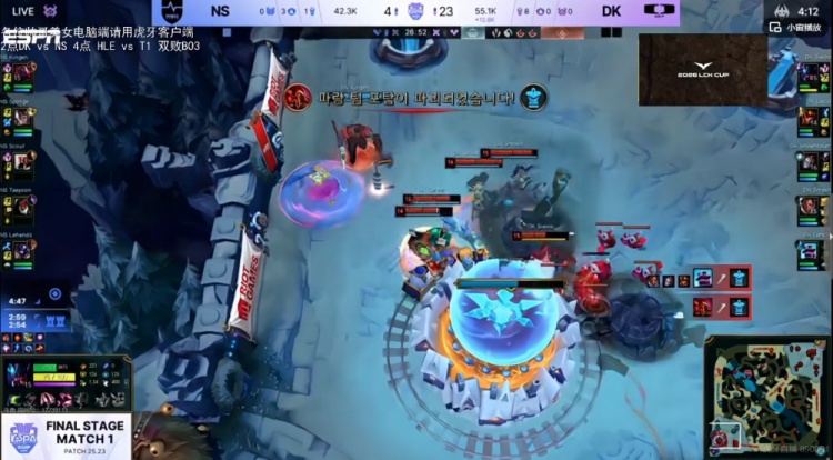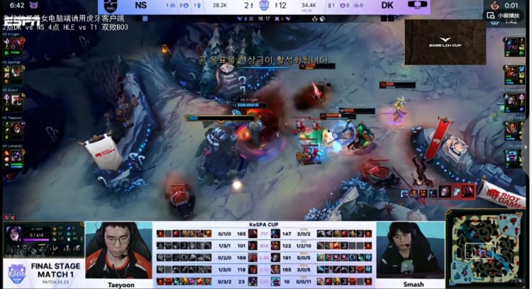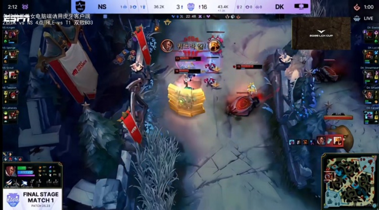 [17:40]Lehends牛头坐先锋撞塔直接被开,ShowMaker发条大招卷到了Lucid皇子盖大的NS野辅!Scout沙皇进场开推被SMK右侧交闪规避,Siwoo雷克塞大招越塔强杀沙皇!这波DK各个击破,团灭NS拿下听牌龙!6K经济差了啊!