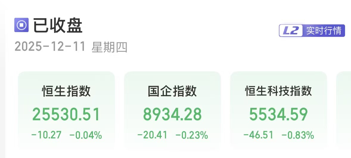 上证报中国证券网讯(刘禹希记者严晓菲)12月11日,港股三大指数高开低走,集体收绿。截至收盘,恒生指数跌0.04%,报25530.51点;恒生国企指数跌0.23%,报8934.28点;恒生科技指数跌0.83%,报5534.59点。
