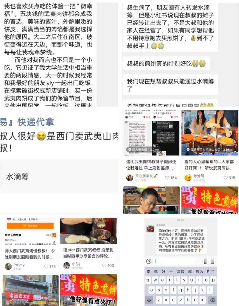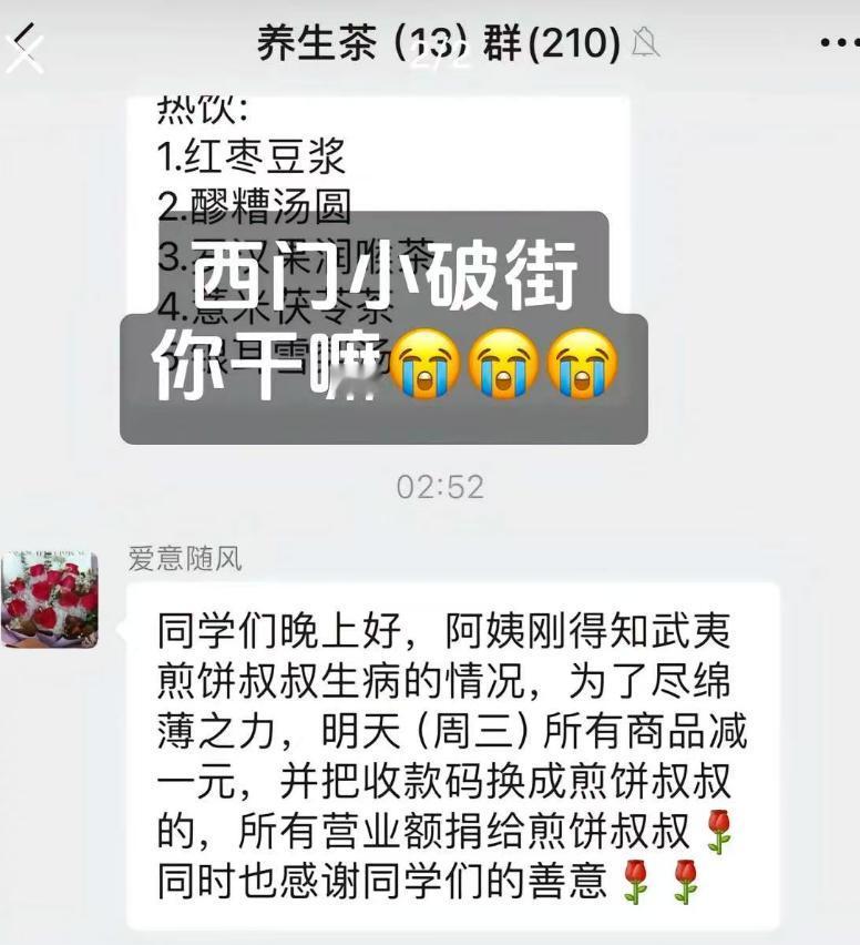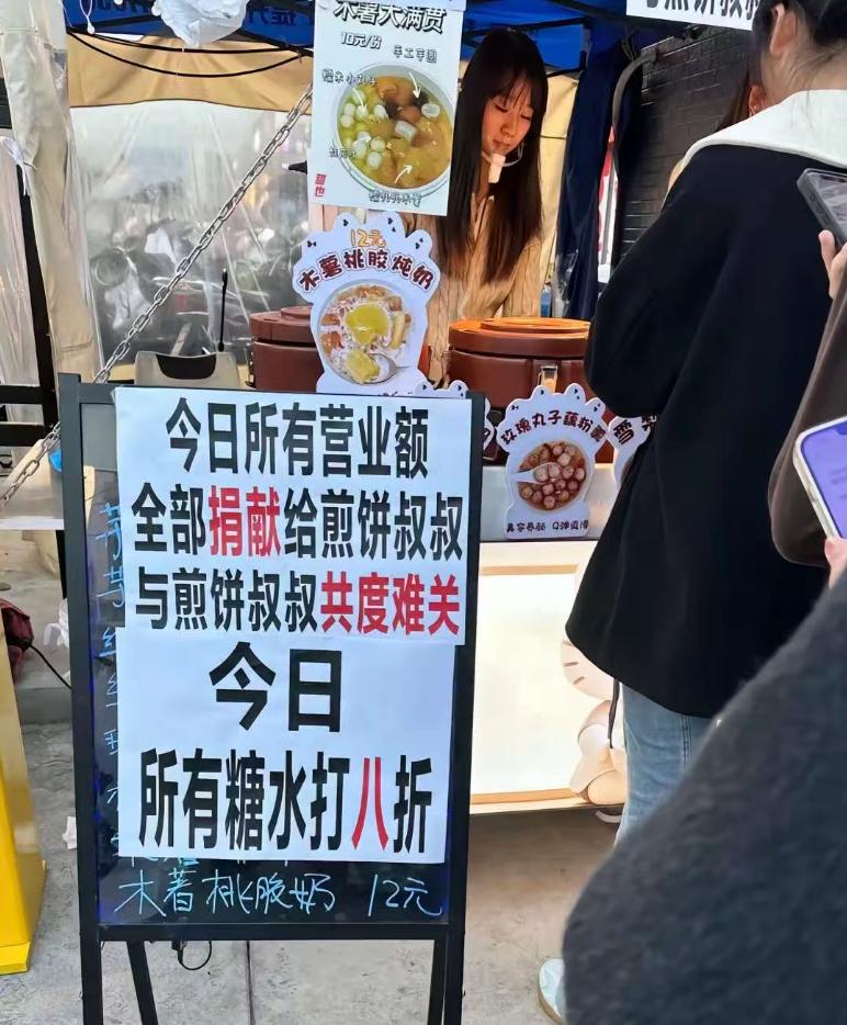 太暖心了!近日福建师大旗山校区的小吃街上,50岁的煎饼摊摊主张建武突患癌症,作为家里的顶梁柱,张师傅的病倒让全家一下失去了经济来源,高昂的治疗费让全家捉襟见肘,没想到的是,在了解到情况后,所有小吃街的摊主都换上了张师傅的收款码,将今日的所有营业额都捐给张师傅,而学生们的行为更让人暖心。 张建武师傅在小吃街上摆摊卖煎饼已经很长时间了,每天都会把自己的摊位收拾的干干净净,饼也摆的整整齐齐,辣椒酱更是一绝,同学随口的一句想买辣椒酱,他都会免费送一大袋, 尽管为了省点摊位费宁愿把摊位摆在最里面,但张师傅抱怨过生活,也没想过涨价,舒心的服务和出色的手艺,被学校的学生们亲切的称为煎饼叔叔。 可麻绳专挑细处断,前不久,张师傅突然感觉身体不适,去医院一检查竟然是癌症,无奈之下,张师傅只能关闭摊位接受治疗,高昂的医药费很快就掏空了家底,治与不治最后都是家破人亡,妻子面对医药账单经常默默流泪,一家人的生活陷入了绝境。 无奈之下,张师傅的妻子只能通过网络发声,将丈夫的事情发到了网上,希望能有好心人帮助一二,让丈夫脱离险境,没想到的是,视频发出后瞬间在学生群体中广泛传播,不少热心的学生们联系上张建武师傅,纷纷捐款送上祝福。 妻子看着学生们的捐款心中特别不是滋味,这些学生有的是张师傅的常客,有的则是素未谋面的陌生人,自己之前都不知道他们的名字,但他们都有一颗善良的心,愿意伸出援助之手。 小吃街的其他店主们也得知了张师傅的情况,纷纷把收款码统一换成了张师傅的收款码,组织义卖,将全天的营业额都捐给张师傅,同学们也纷纷走出校门,在小吃街排起了长队,帮助张师傅一家度过难关。 现在还有越来越多的人知道了张师傅的情况,还有很多的摊主自发加入义卖的行业,与张师傅共渡难关,甚至还有不少网友通过视频中流出的收款码,给张师傅送上自己的微薄之力,这份温暖实在是令人动容。 命运被一个人推向绝境,但是善良的人会执着的把你从绝境中拉回来,张建武师傅在患病后,生活一度陷入窘境,没有收入来源,每天还有高昂的医药费,这换到哪一个普通人身上都是灭顶之灾,但是善良的学生,热心的同事,此刻同张师傅站在一起,向死神说不,这份寒冬中炽热的温暖,最令人动容。 你怎么看?评论区说说吧。