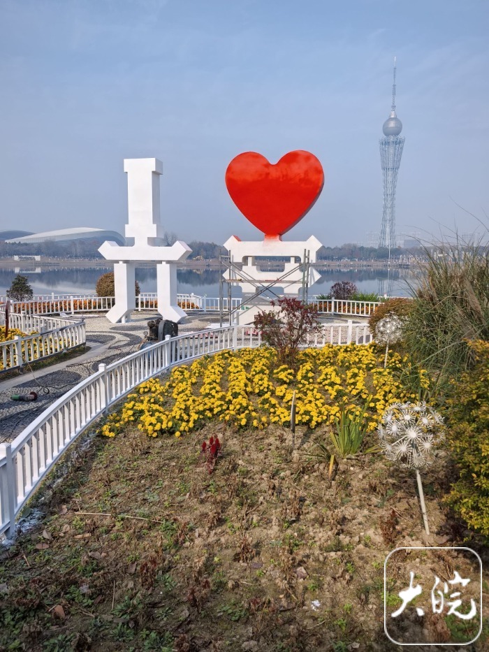 12月11日上午,大皖新闻记者来到月亮岛时看到,该网红标志正在维修中,现场设置了施工标志牌,写着“施工区域注意安全”“油漆未干请勿触摸”,地上还有维修设备等物品。该网红标志已被重新喷涂了红色和白色两种油漆,显得十分鲜亮。