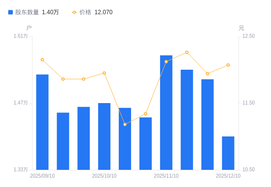 日期A股户数(户)流通A股户均持股数(股)户均持股市值(万元)2025-12-101400011516.2913.902025-11-281520010607.1112.662025-11-201540010469.3512.842025-11-101570010269.3012.452025-10-311440011196.3912.702025-10-201460011043.0212.352025-10-101470010967.8913.112025-09-301462011027.9113.082025-09-191450011119.1813.192025-09-101530010537.7812.80