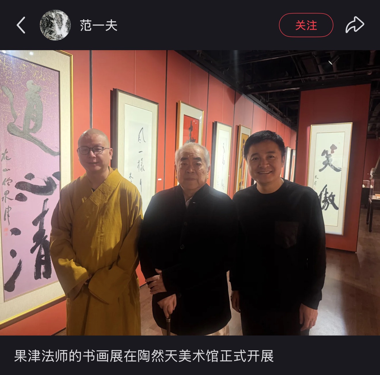 11月9日,“范一夫”的小红书账号再次发布了一张果津法师书画展在陶然天美术馆开展的照片,范曾也出现在照片中。
