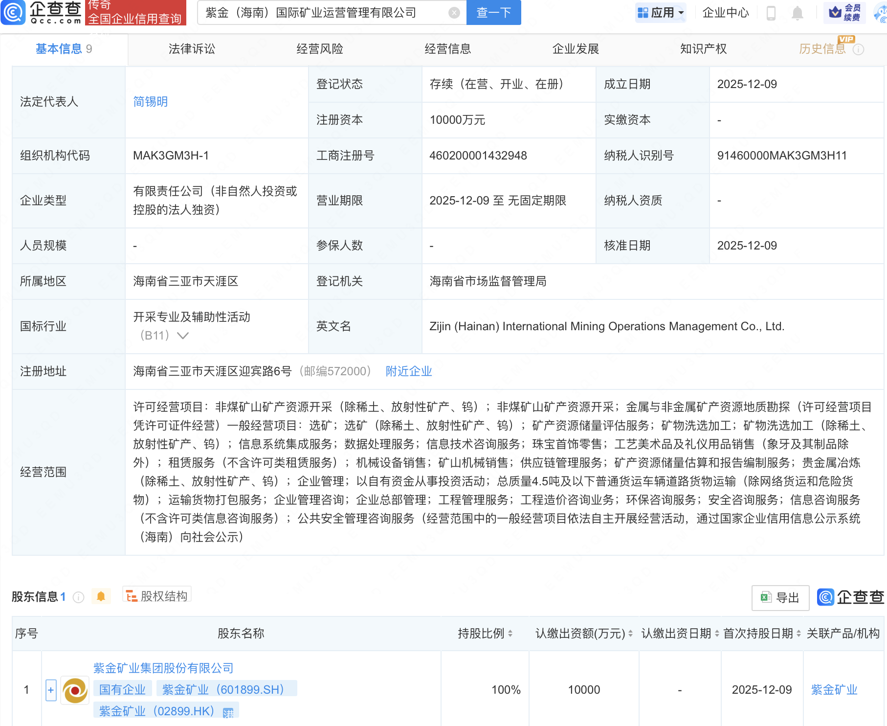 企查查APP显示,近日,紫金(海南)国际矿业运营管理有限公司成立,注册资本1亿元,经营范围包含:非煤矿山矿产资源开采;金属与非金属矿产资源地质勘探;供应链管理服务;矿产资源储量估算和报告编制服务等。企查查股权穿透显示,该公司由紫金矿业(601899)全资持股。