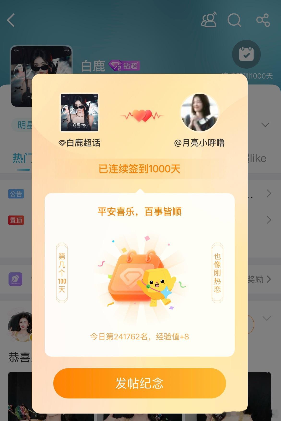 记录一下白鹿超话520w鹿茸✅刚好也是月亮小呼噜连续签到1000天✅越来越多鹿茸