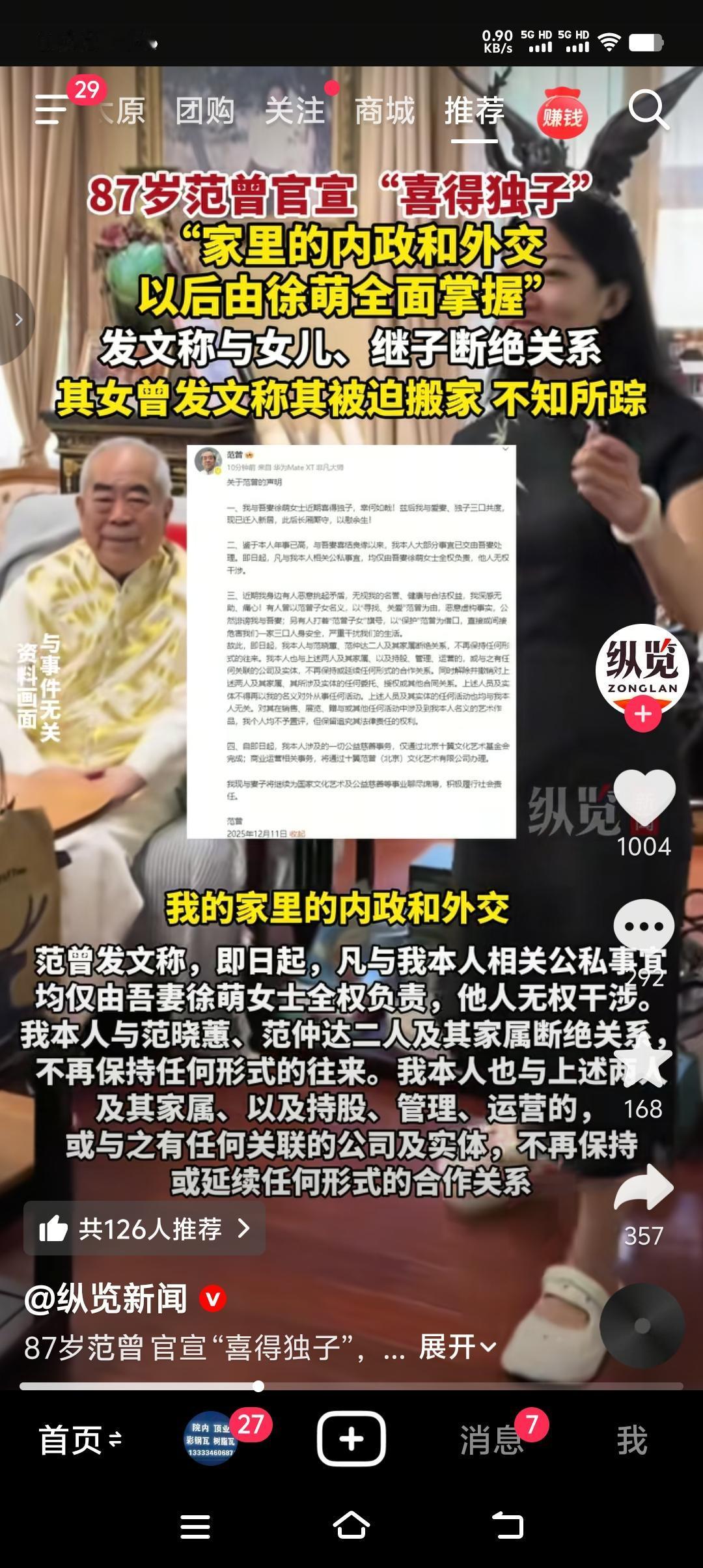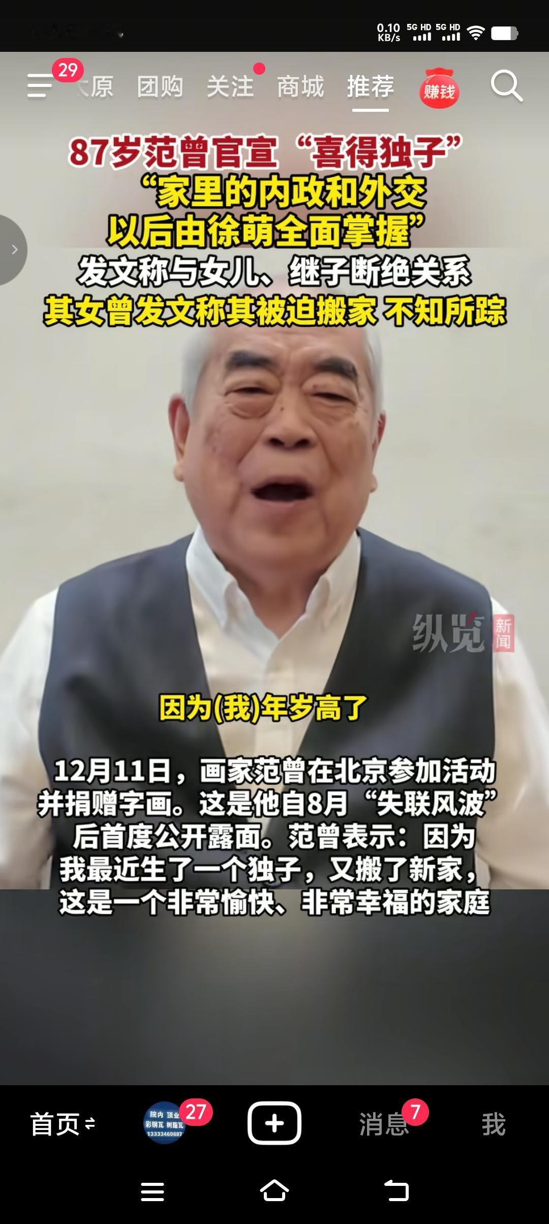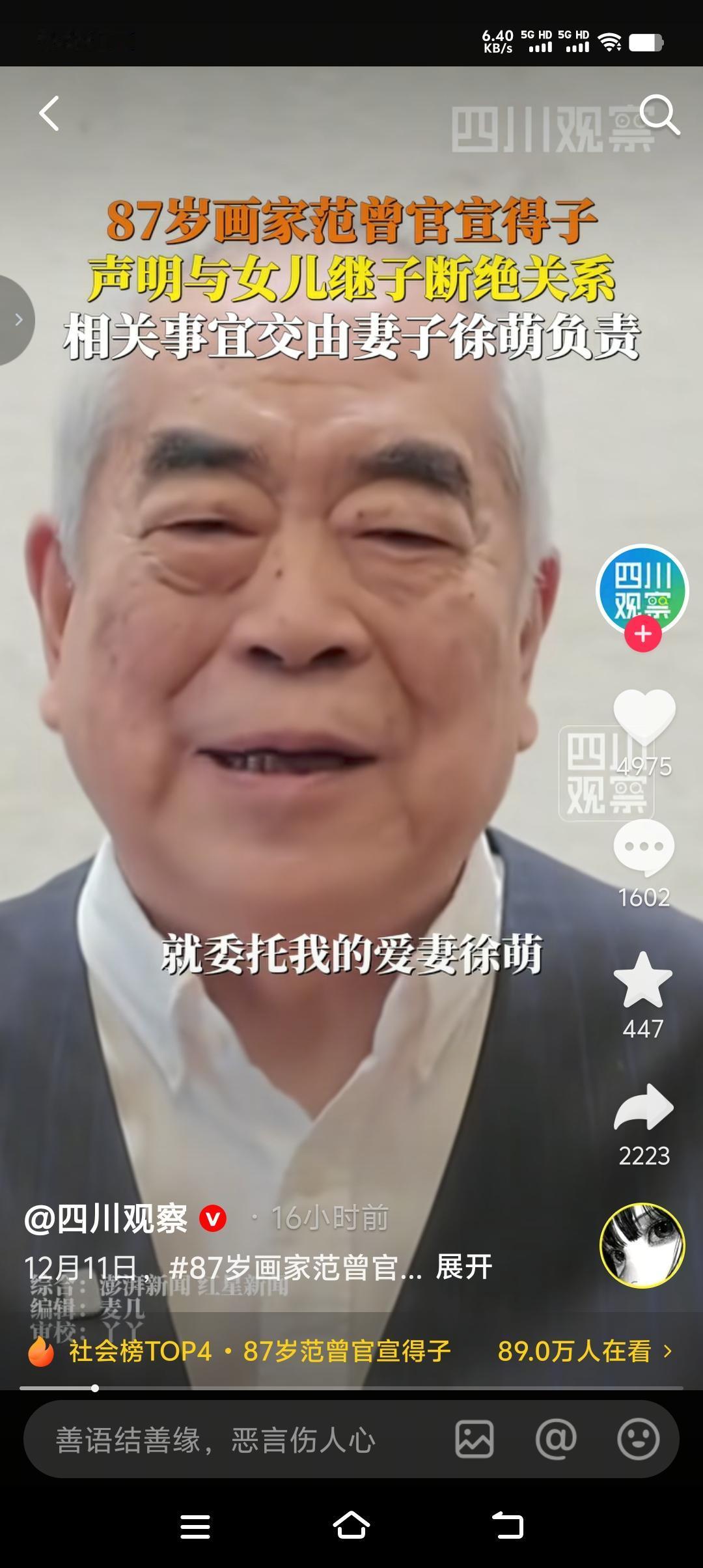 看了范曾,你还觉得年龄是问题吗?事实证明只要你有钱,所有的问题都不是问题。87岁高龄,有的人已经挂在了墙上,有的人已经拄上了拐杖,有的人每天背靠南墙晒太阳。然而对于著名大画家范曾来说,87岁却是还在造人的路上。我们实在无法想象,当孩子上了学开家长会的时候,老师、学生看到家长居然是位老态龙钟的世纪老人时,真不知是一种怎样的感受。 与继子断绝关系可以理解,但与亲生的姑娘断绝关系实在无法理解,毕竟是有血缘关系的。自古道“爱江山更爱美人”,看来范曾为了小自己50岁的娇妻也是豁出去了。这也意味着范曾以后的财产不会再有任何纠纷,只留给徐萌一个人了。