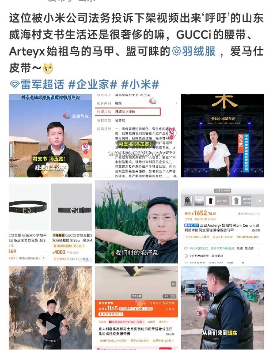 更搞笑的是,网友深扒之后,冯玉宽的“悲情农民”人设直接崩塌。视频里他穿的是9000块的盟可睐羽绒服,系着3000块的GUCCI腰带,这一身行头比不少打工人都奢华,哪里像“小老百姓”?再查发现,他名下有注册资本3000万的建筑公司,直播带货的账号也是2024年刚注册的,根本不是什么纯公益助农账号,反而像借着村支书身份搞商业引流。更离谱的是,他卖的小米还不是当地特产,宣传时还吹“能提升多巴胺分泌71%”,连科学依据都没有,纯属虚假宣传。