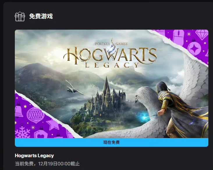 今天 Epic游戏商城可以免费领取 3A大作《霍格沃茨之遗》领取后永久入库,截止时间到 25 年 12 月 19 日 00:00,感兴趣的朋友快去领