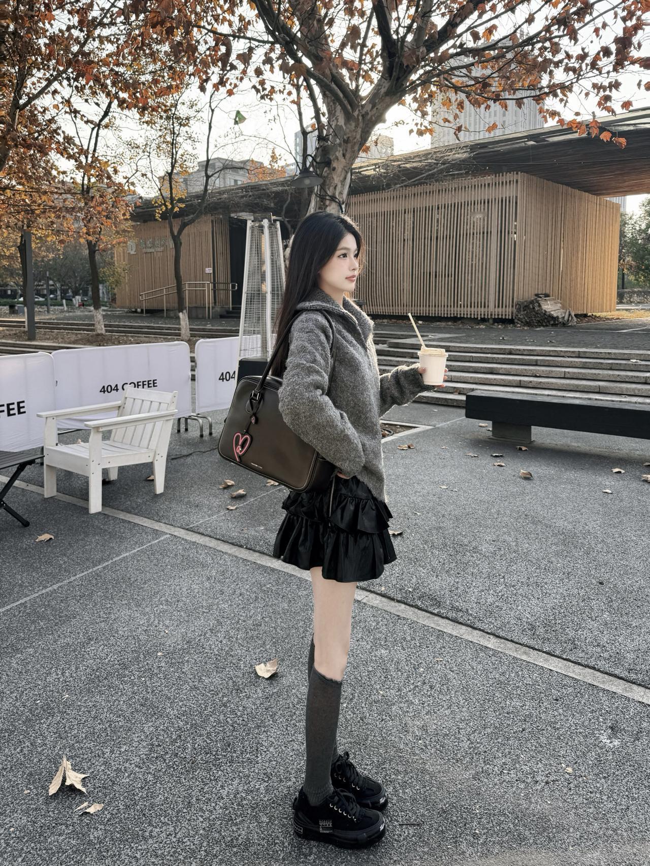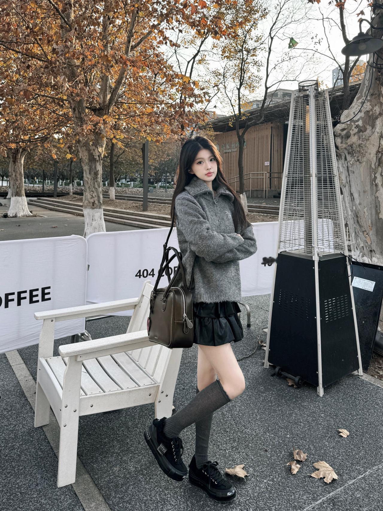 在这个落叶像雪的季节🍂|||🍁枫叶季的今日穿搭分享 灰色毛绒半拉链卫衣➕蛋糕