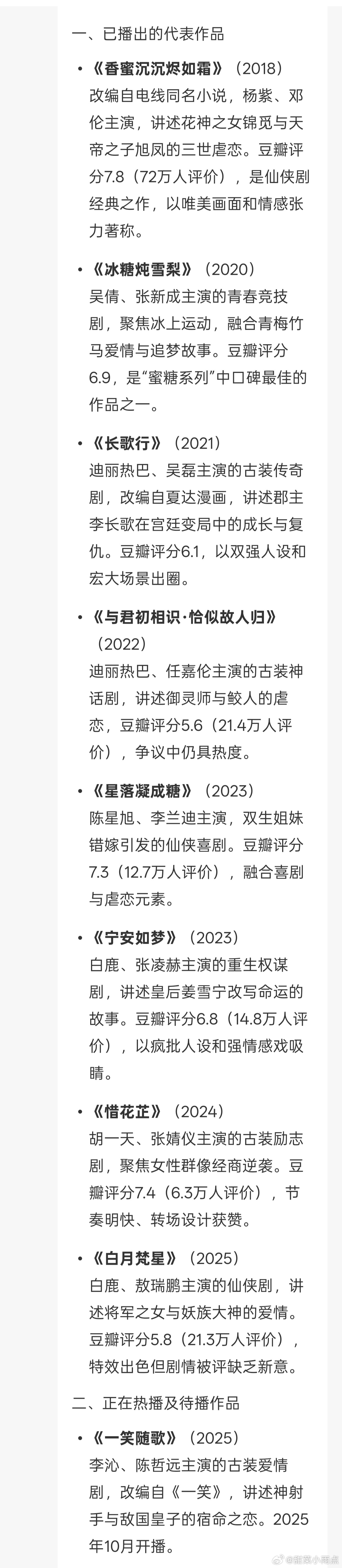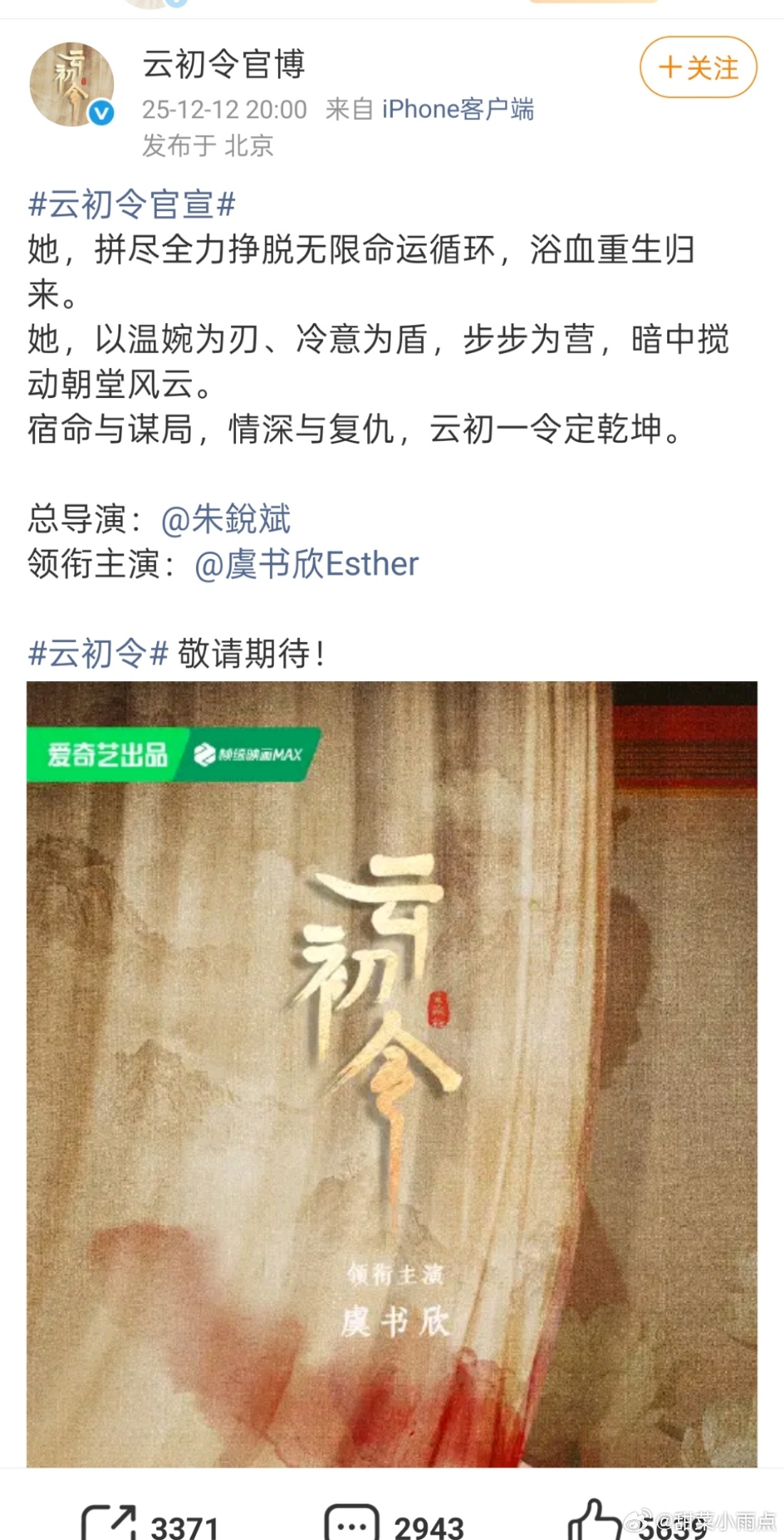 虞书欣官宣的《云初令》总导演朱瑞斌看着很眼熟,一搜原来是香蜜的导演,还执导了白鹿的白月梵星,宁安如梦;迪丽热巴的长歌行;还有刚播完的一笑随歌……看来这次的班底还不错,虞书欣是否能把握住这次机会鲨回来?