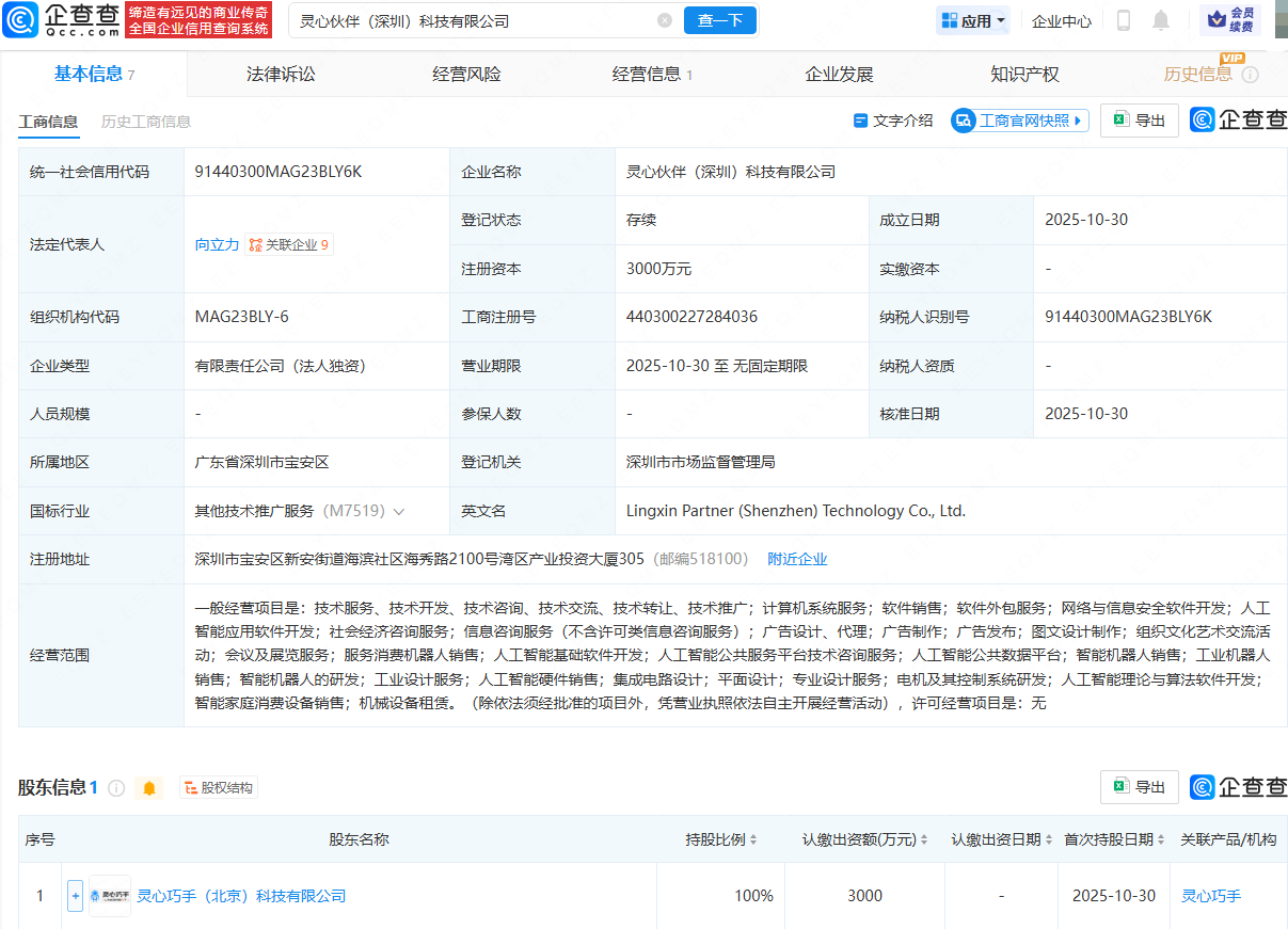 企查查APP显示,灵心伙伴(深圳)科技有限公司成立,法定代表人为向立力,注册资本为3000万元,经营范围包含:服务消费机器人销售;人工智能基础软件开发;人工智能公共数据平台;智能机器人销售等。企查查股权穿透显示,该公司由灵心巧手(北京)科技有限公司全资持股。