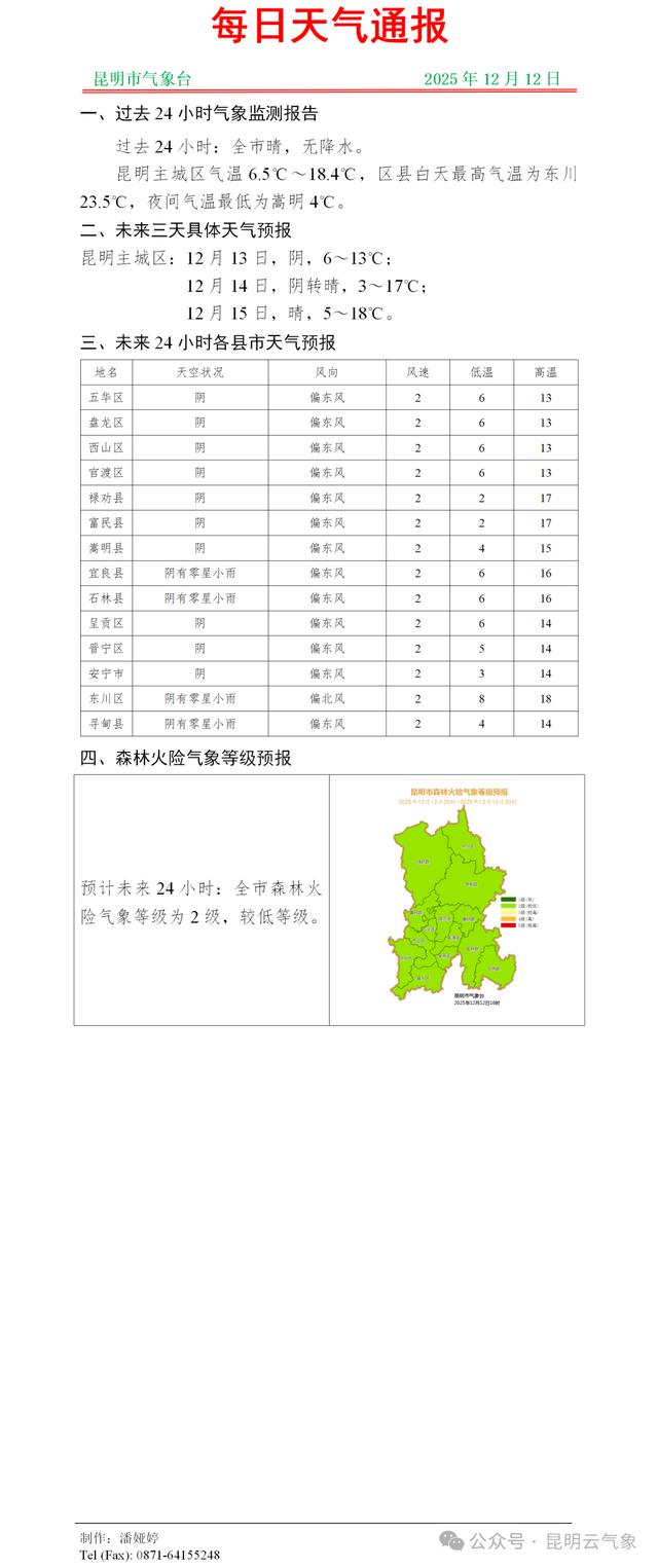 另外,本周末迪庆州北部、昭通市、曲靖市北部高海拔路段可能出现轻到中度道路结冰,云南省中东部和南部地区清晨局地有大雾天气,需注意交通安全。