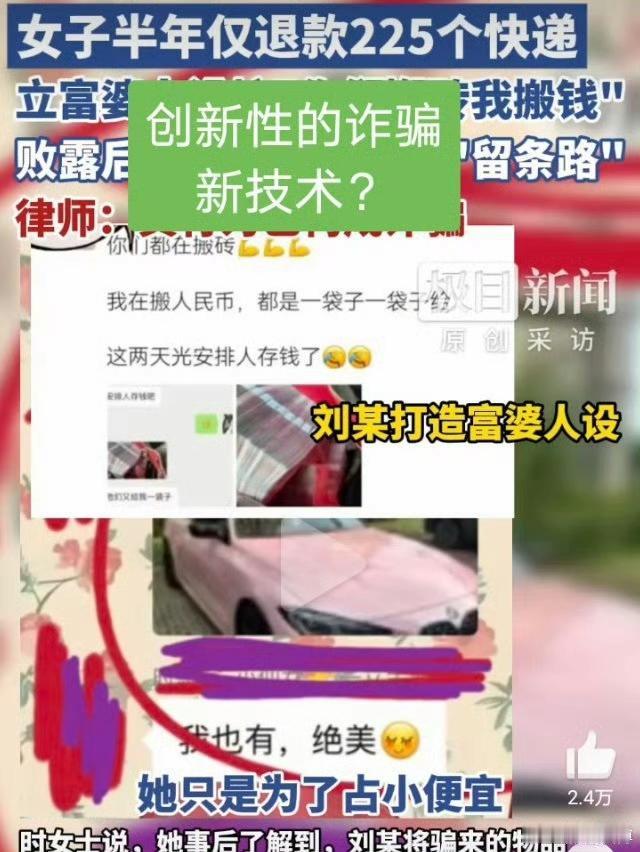 女子半年“仅退款”225个快递还立富婆人设,骗局败露后求卖家“留条路”,律师:已构成诈骗 近日,一起堪称“薅羊毛”天花板的快递诈骗案引发热议。山东烟台女子刘某在半年内,利用6个账号对广州商家时女士实施“仅退款”操作225件331单,涉案金额超5.4万元,更离谱的是,她还靠转卖骗来的商品打造“富婆人设”,最终骗局败露,上演了一出求卖家“留条路”的戏码。 据商家时女士爆料,刘某的诈骗手法堪称“精心策划”。她会同时购买多款从十几元到上千元不等的商品,在快递未签收时,对贵价商品申请“仅退款”以拦截快递,随后用吹风机吹下快递面单,将低价商品的面单贴在贵价商品退回的包裹上,以此蒙混过关。 由于仓库通常不会检查被拦截的退回快递,这一手法让她屡屡得手,直到某次面单贴漏了破绽,才被时女士察觉。 更让人气愤的是,刘某将骗来的商品在二手平台和粉丝群里低价销售,营造“供不应求”的假象,同时还在社交平台疯狂炫富,发朋友圈称“你们搬砖我搬人民币,一袋子一袋子存钱”,把诈骗所得包装成“富婆”的资本。 骗局败露后,刘某却丝毫没有意识到自己的行为已触犯法律,先是分两次给时女士转账2万和3万,企图补齐差价,还编造“老公去世带孩子”的悲情故事,恳求时女士“留条路”。 但时女士态度坚决,表示“不接受任何道歉,一切交给警方处理”,并于12月1日向广州警方报案,目前案件已正式受理。 无独有偶,12月9日,上海一位服装店店主也站出来声援时女士,称自己也被刘某用同样手法诈骗,这意味着刘某的受害者可能不止一人。 对此,河南泽槿律师事务所主任付建表示,刘某以非法占有为目的,利用平台和快递漏洞,通过“仅退款”、互换面单换货等手段,从一开始就没有支付等价货款的意图,且虚构退货理由转卖赃物,致使商家遭受重大损失,其行为已符合诈骗罪的构成要件,必将受到法律的严惩。 这起案件也给广大商家敲响了警钟,面对“仅退款”请求需提高警惕,同时也提醒消费者,任何试图钻平台漏洞、非法牟利的行为,最终都将付出法律代价。仅退款骗局 全额退款骗局 网购退款陷阱 整治仅退款 仅退款奇葩理由 假快递骗局 仅退款应对策略 仅退款纠纷 信息来源:极目新闻