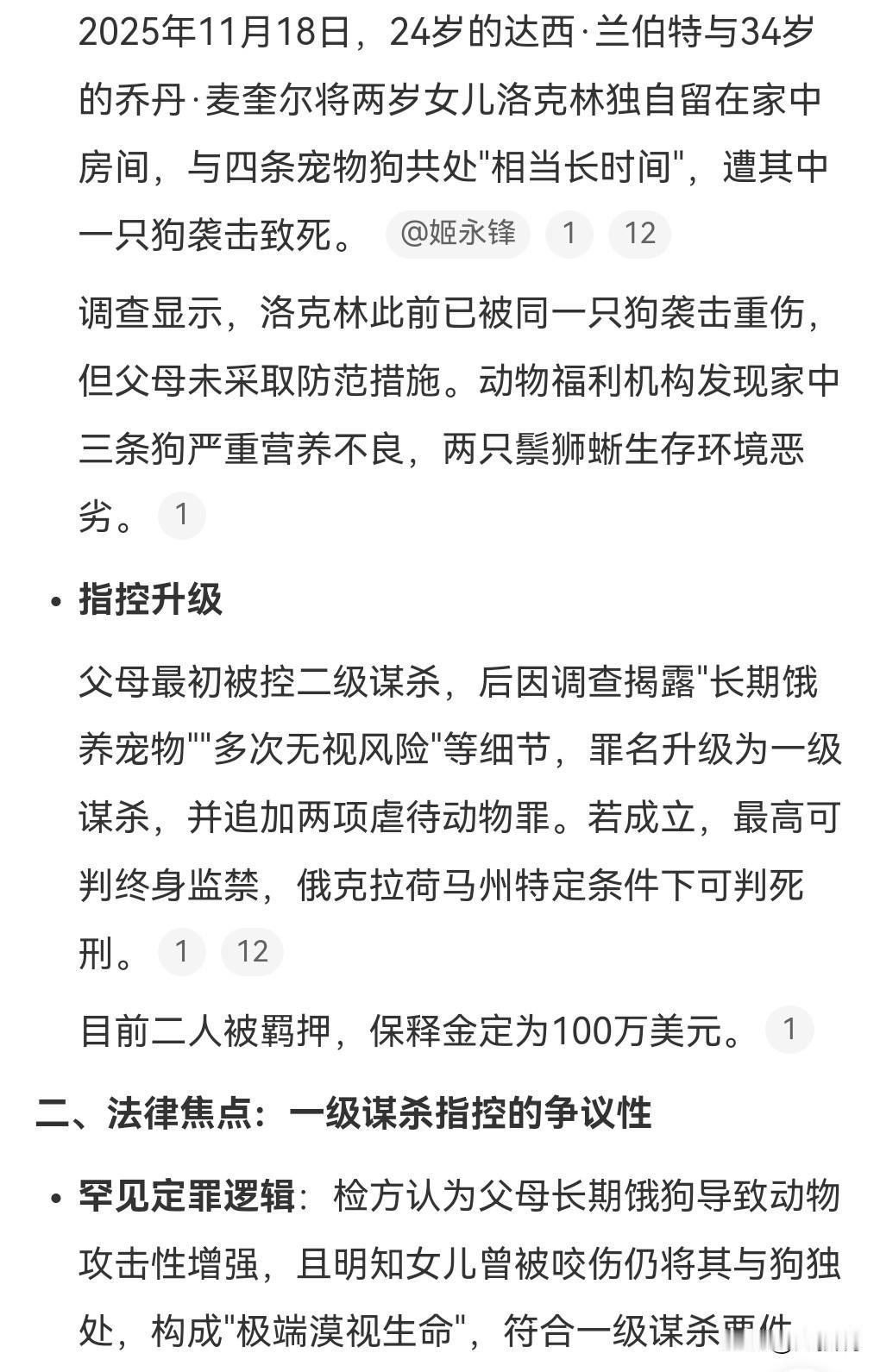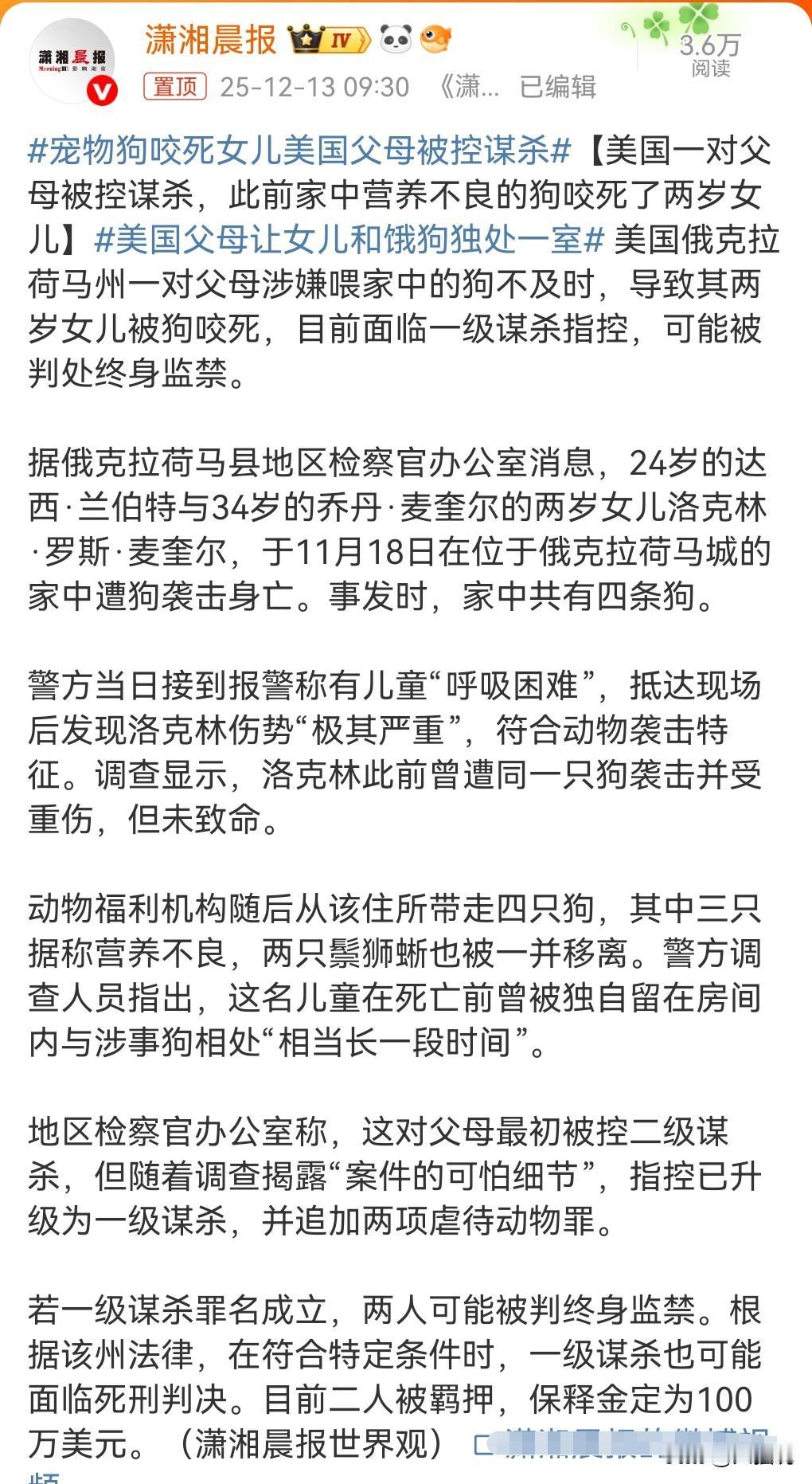 遇到这样的父母,真的是孩子的悲剧。 一定要把狗喂饱,要不然狗咬人就麻烦了。 美国一对父母经常饿养自己的宠物狗,结果这狗把女儿给咬死了。 而且女孩不是第1次被咬了,这对父母竟然没有做防范,这实在是太恶劣了。 所以被控谋杀,有可能被判处终身监禁,也有可能是死刑。 这真是敲响了警钟。
