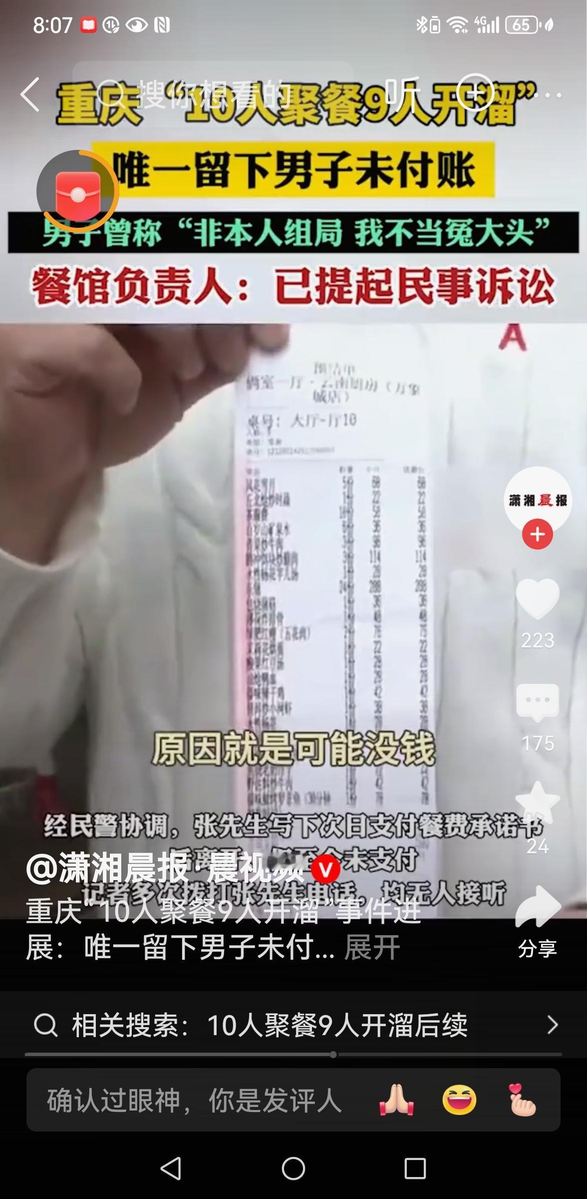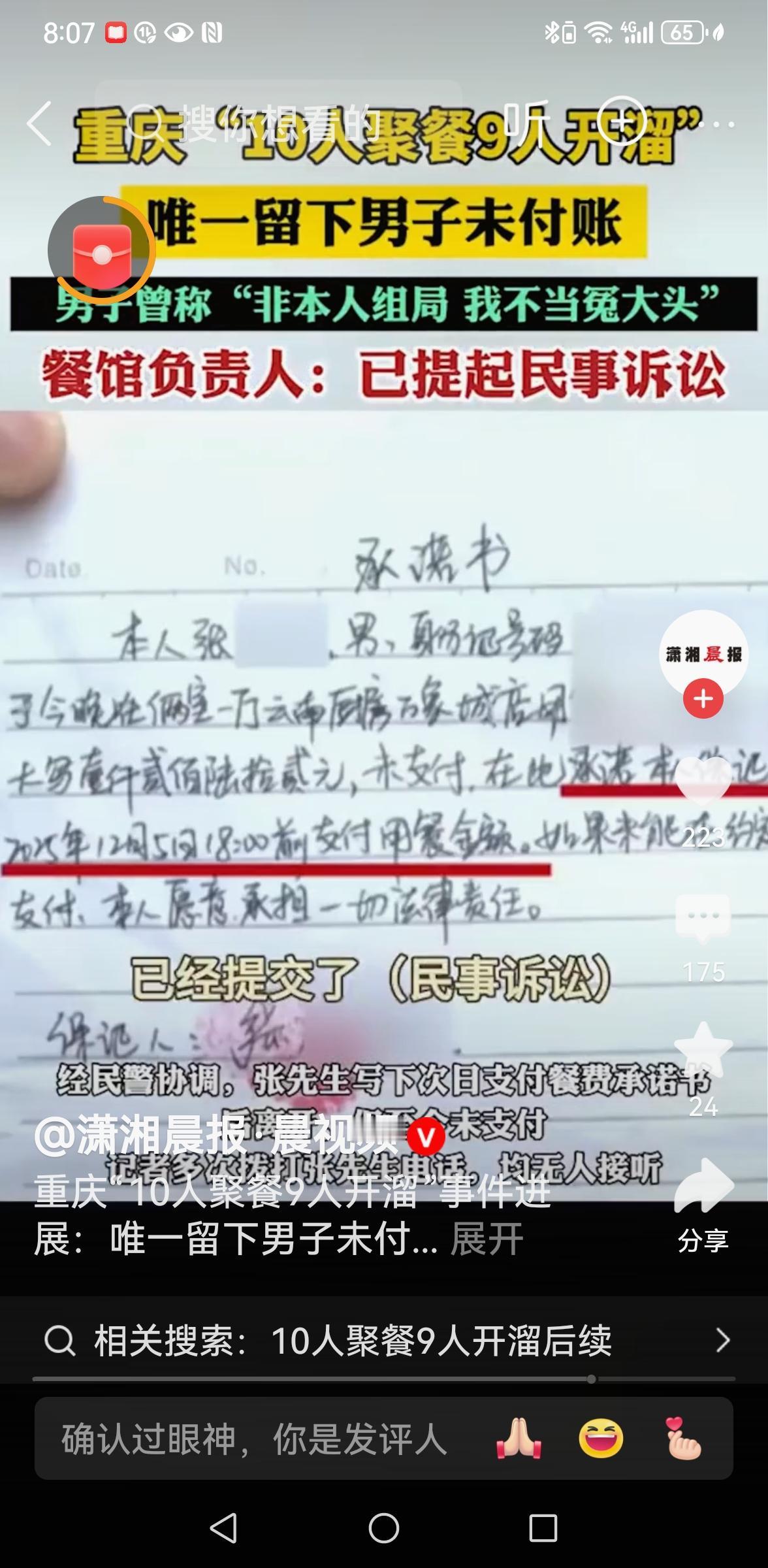 10人聚餐9人开溜,唯一留下的他拒付全款:这顿饭到底该谁买单? 重庆一家餐馆里,一场普通的聚餐演变成一场道德与法律的双重考验。10人聚餐结束后,9人“默契”开溜,唯一留下的张先生面对1262元账单,坚决拒付:“我不是组局者,不当这个冤大头!” 这场聚餐背后,是一场关于人情世故与个人责任的现实寓言。 一场聚餐,照出十种人心 想象这个场景:餐桌上推杯换盏,称兄道弟;结账时眼神闪躲,脚步匆匆。9个人以各种理由“巧妙”离场,只留下张先生面对一桌残羹冷炙和一张千元账单。 张先生的愤怒可以理解。他不是组织者,却要承担全部费用;他不是最富有者,却要为9个人的“默契逃离”买单。在民警协调下,他虽写下付款承诺书,但回家后越想越气,最终选择拒绝履行。 餐馆老板同样委屈——开门做生意,成本明摆着,总不能因为顾客内部纠纷就自认倒霉。 谁该为这顿饭买单?法律与道德的碰撞 从法律角度看,餐馆有权向参与聚餐的任何人要求支付全部餐费。张先生签下承诺书,更增加了他的付款责任。然而,从道德层面,那些悄悄溜走的人,是否应该承担主要责任? 这起事件之所以引发广泛共鸣,因为它触及了我们每个人都可能遇到的困境:朋友聚会后,总有人“忘记”带钱包;同事聚餐后,总有人“恰好”去洗手间而错过结账时刻。 社交饮食背后的信任危机 这场1262元的纠纷,实际上暴露了当代社交中的信任危机。当“逃单”成为一种集体默契,当责任被巧妙地推给最后留下的人,我们不禁要问:人与人之间的基本诚信去哪儿了? 张先生的坚持,不仅仅是为了1262元钱,更是为了讨一个公道:凭什么守规矩的人要吃亏?凭什么负责的人要承担全部后果? 餐馆已提起民事诉讼,这场官司无论结果如何,都已经在社交媒体上引发了一场关于责任、诚信和友谊的讨论。 写在最后 这起事件最令人深思的是:如果当时10个人平均分担,每人仅需126元。为节省这126元,9个人选择逃避,却让一个人面临法律诉讼,也让自己的人品在朋友圈中打了折扣。 生活中的很多困境,其实都是“聪明反被聪明误”的写照。真正的智慧不是如何巧妙地逃避责任,而是如何公平地承担自己应尽的部分。 当我们下次参加聚餐时,不妨多一份担当;当我们组织聚会时,不妨提前明确付费方式。毕竟,维系人与人之间关系的,不仅仅是美食,更是那份彼此尊重、互不亏欠的坦然。 这1262元账单,买的不仅是一顿饭,更是一堂关于诚信与责任的公开课。你说,这钱,该谁付?聚餐账单