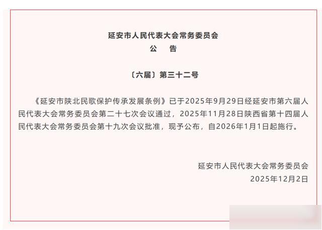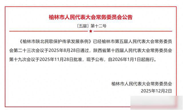 近日,榆林市人大常委会发布公告:《榆林市陕北民歌保护传承发展条例》公布,将于2026年1月1日起施行。