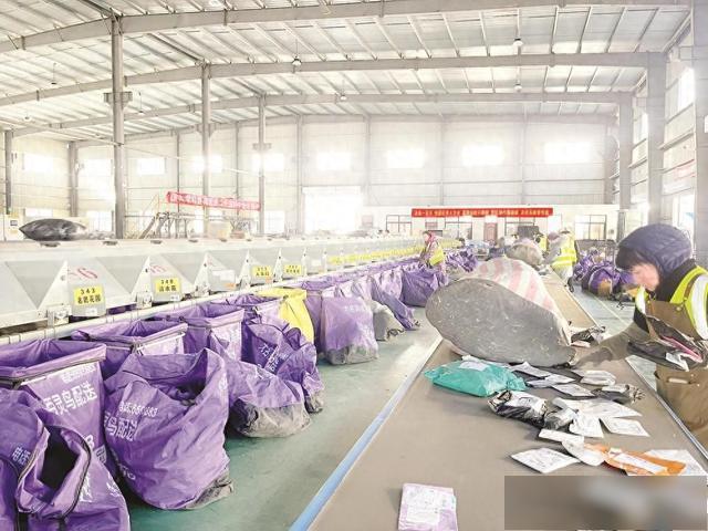 走进这个占地5000平方米的快递物流配送中心,只见场地中央有一个“体型”庞大的自动分拣设备,大小不一的各式快递在履带上快速传送,几十名工人在一旁有条不紊地归拢整理从档口传下的包裹。