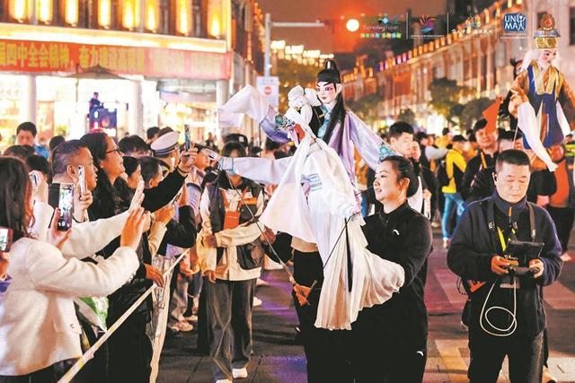 “你好,泉州!”当晚7时30分,近200名中外木偶演员从泉州府文庙广场出发,途经中山路,直到钟楼再折返府文庙广场,参与人员和着木偶艺术的韵律,一路前行一路挥舞,并用不同语言喊出对泉州的祝福,吸引了大量市民游客驻足观看,拍照纪念。