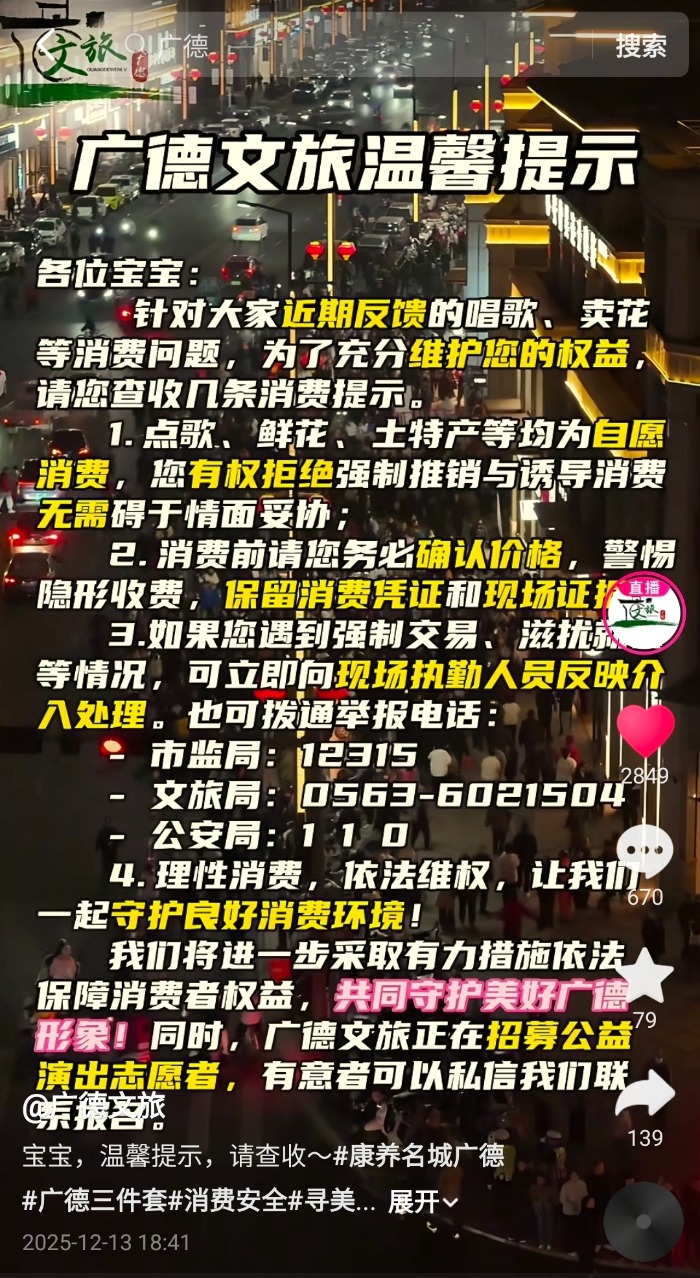 针对大家近期反馈的唱歌、卖花等消费问题,12月13日,社交平台账号“广德文旅”发布了一则温馨提示,其中提到,“点歌、鲜花、土特产等均为自愿消费,您有权拒绝强制推销与诱导消费,无需碍于情面妥协;消费前请您务必确认价格,警惕隐形收费,保留消费凭证和现场证据;如果您遇到强制交易、滋扰就餐等情况,可立即向现场执勤人员反映。”