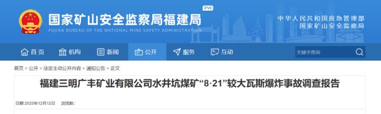 12月12日,国家矿山安全监察局福建局发布《福建三明广丰矿业有限公司水井坑煤矿“8·21”较大瓦斯爆炸事故调查报告》。