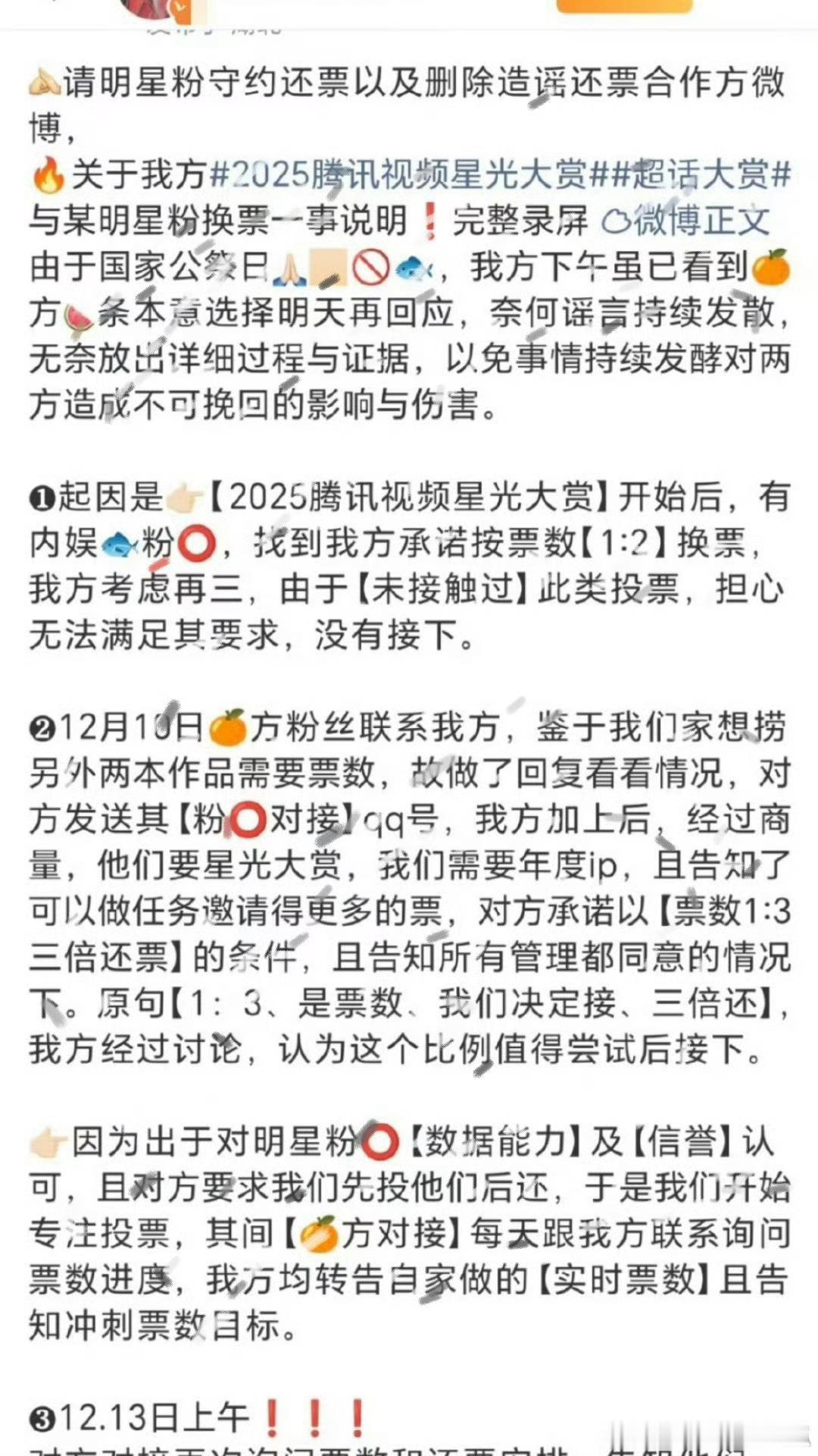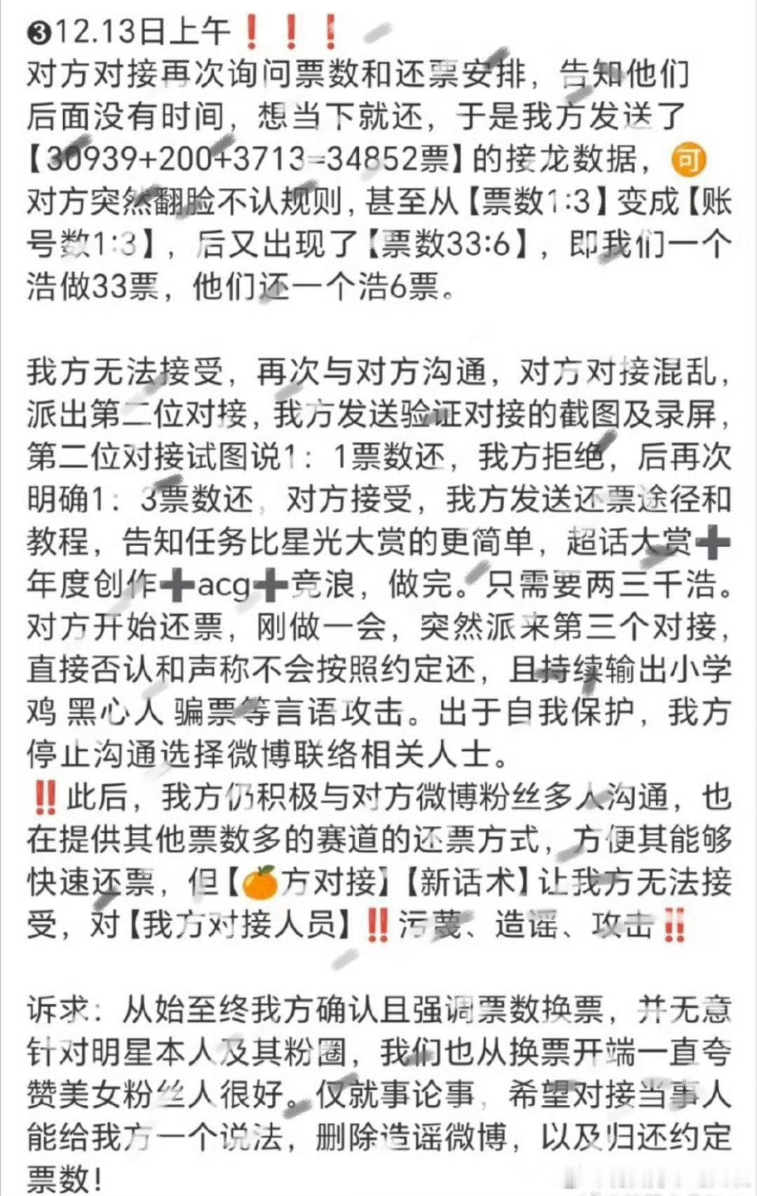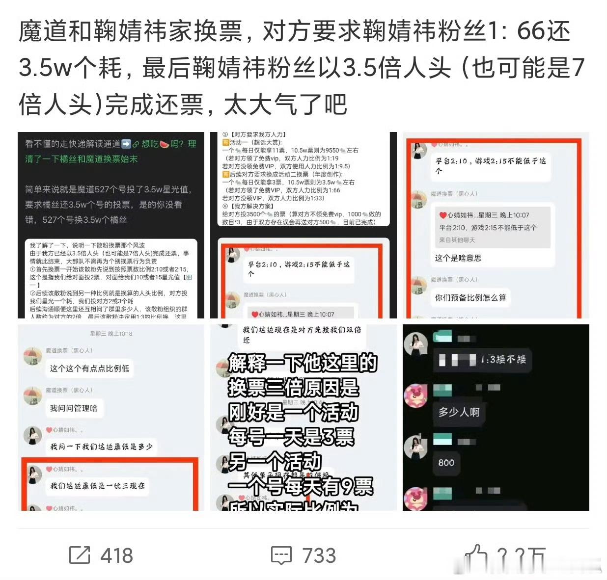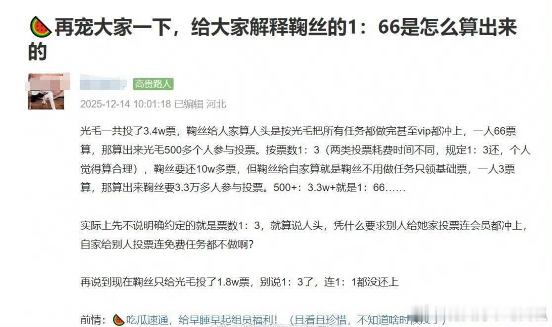 围观鞠婧祎粉丝跟《魔道祖师》粉的换票🍉光毛一共给🍊投了近3.5w🎫,最后🍊丝只投了1.8w,连1:1都没还完,就敢吹仁至义尽7倍人头了、、、这算赖票吗?按🍊丝的计算比例,光毛投星光大赏是要充会 员的,🍊丝只要免费就可以,现在被网友锐评零元购了😅星光大赏