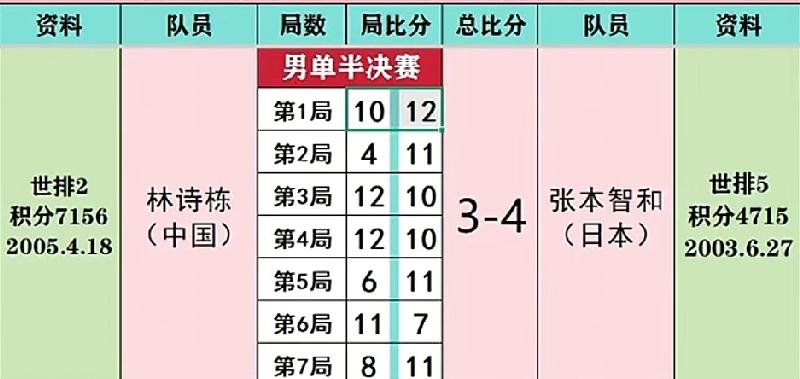 逆转失利,林诗栋3-4不敌张本智和,止步半决赛。 2025年12月14日13:30分,WTT香港总决赛,首场男单半决赛,林诗栋经过7局鏖战,以3-4不敌张本智和,无缘晚间的决赛。 双方之前职业生涯交手6次,林诗栋1胜5负,处于劣势。 本场比赛打得跌宕起伏、悬念重生,林诗栋中远台对拉占优,张本智和台内球占据上风,小石头控制心态方面还是有所欠缺,关键球处理不够坚决,最终未能打破魔咒,7局比分为:10-12/4-11/12-10/12-10/6-11/11-7/8-11。 稍后,将进行第二场半决赛,由国乒大将王楚钦,迎战瑞典选手莫雷加德。