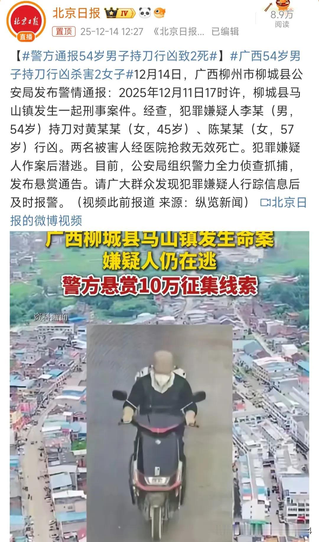 广西柳城县马山镇发生命案,警方悬赏10万征集线索!逃走时骑的两轮电动车,跑往凤山镇或沙埔方向,综合推断他跑不远,有机会的兄弟发财了,能提供真实线索就行! 据说是在亲戚家猪场干活,就因用水跟几个女的发生纠纷!一时冲动就用猪刀杀了两个女的,其中一个有当地网友说他们还是亲戚! 看公布的照片,面相是挺凶狠的,是那种话不多的狠人!看见的千万别逞能、动声色! 天寒地冻,到处是摄像头,电动车又没地充电,相信很快就能抓住他。快过年了,大家都安好!