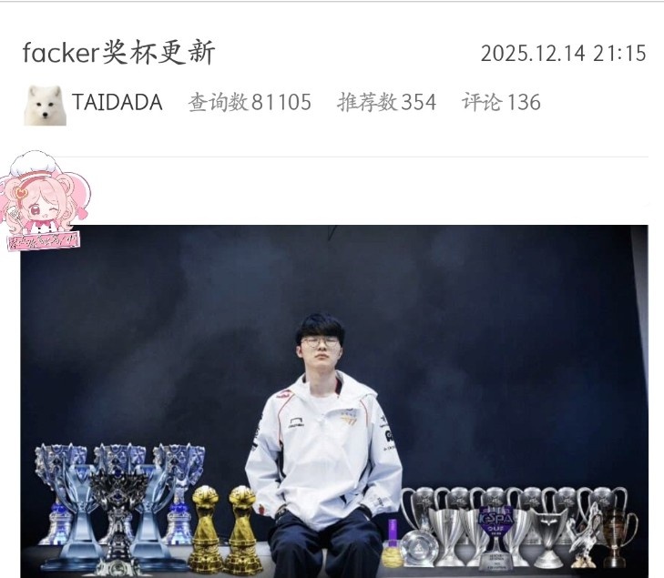 韩网晒照Faker奖杯+1!Faker:明年目标当然也是赢下更多冠军奖杯