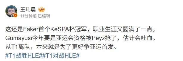 媒体人:Faker生涯又圆满了一点 Guma要是被peyz抢亚运估计会吐血